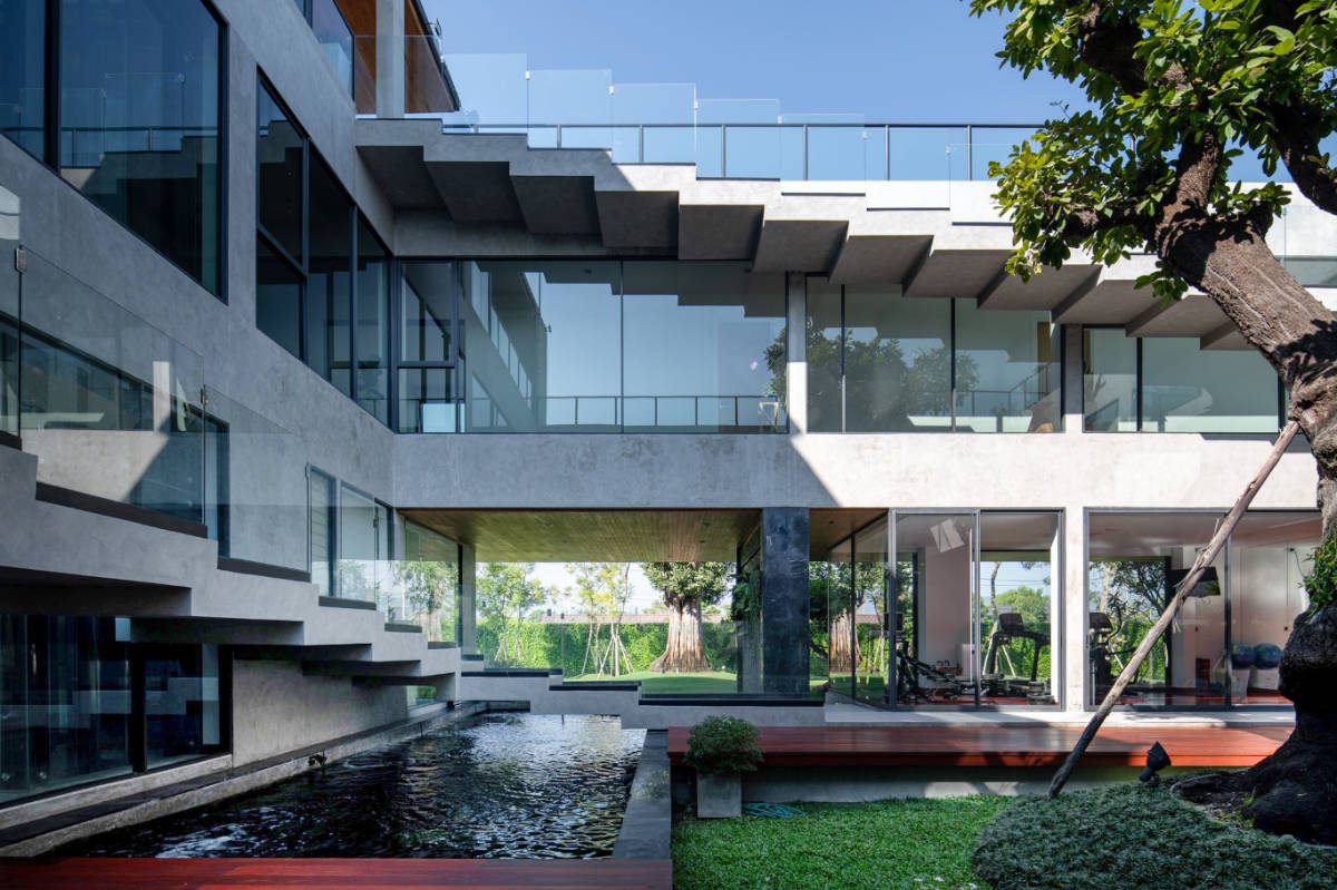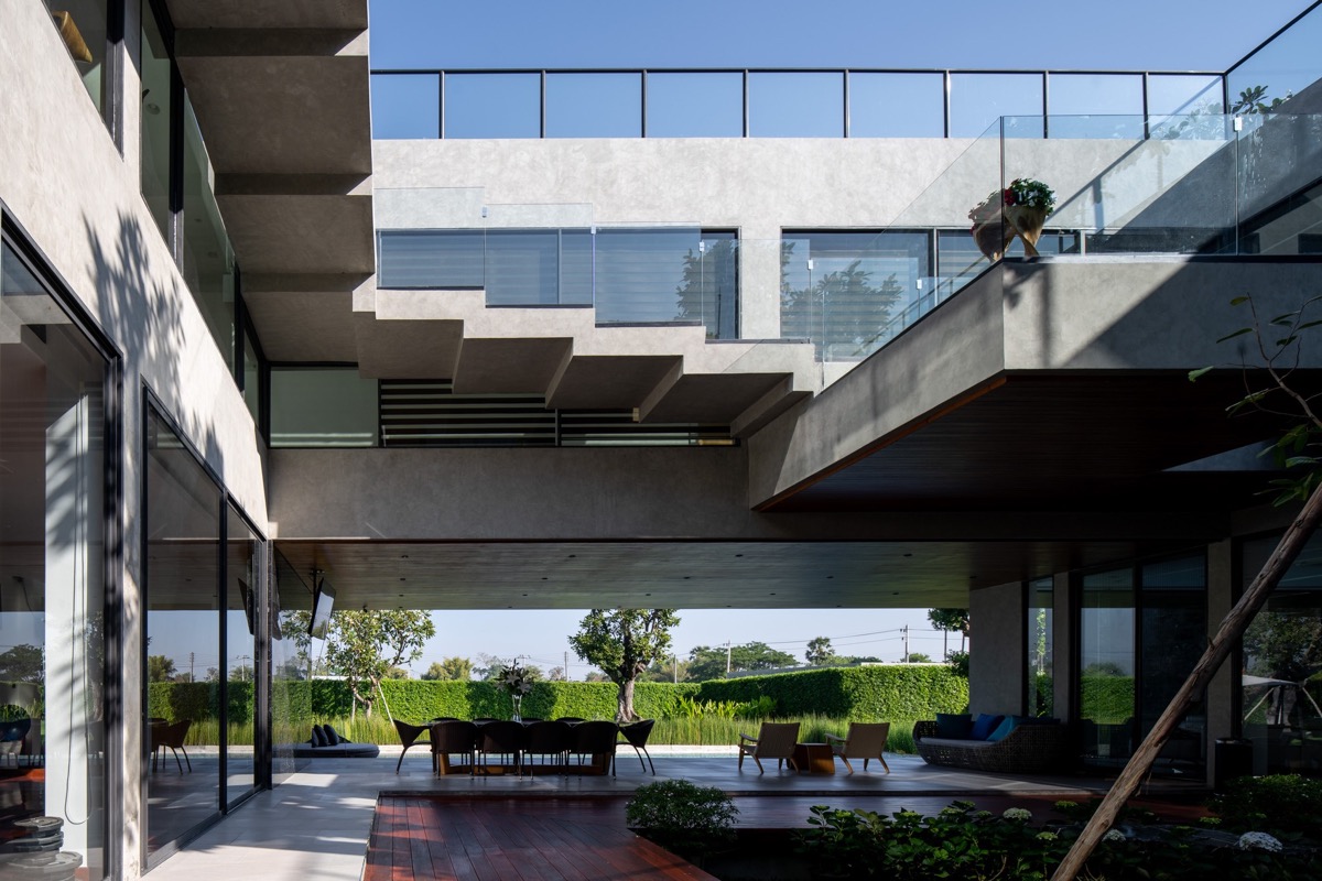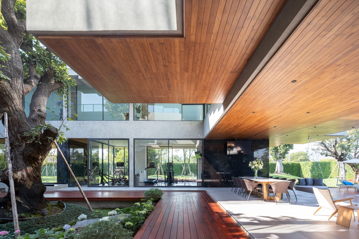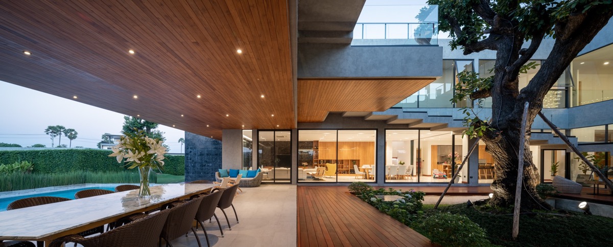 El diseño separa los programas de la casa en 3 espacios principales: interior, exterior y semiexterior. Los espacios semiexteriores son las zonas bajo los voladizos, que se aplica de la casa tradicional tailandesa. Estas tres categorías se consideran igual de importantes, y en este caso se han conectado hábilmente mediante el patio central, que es el corazón de esta casa.