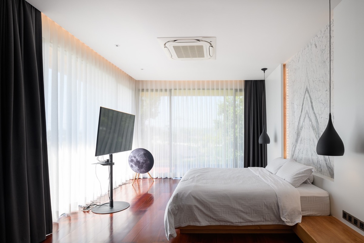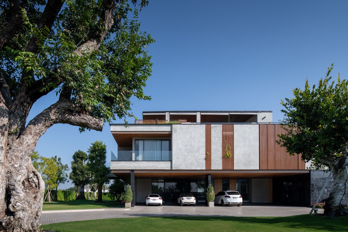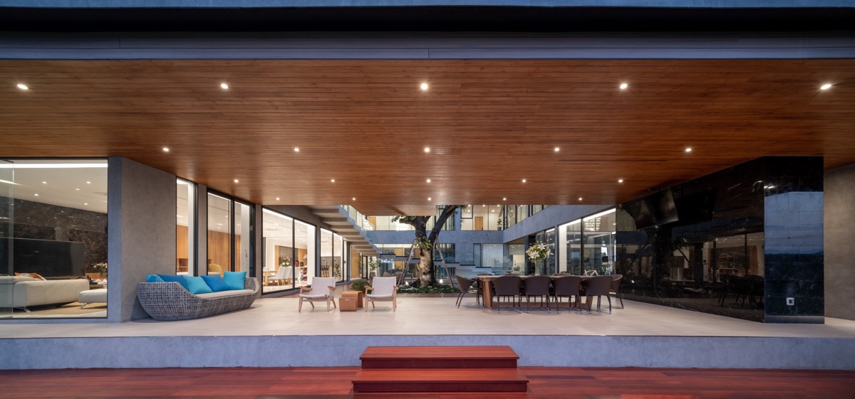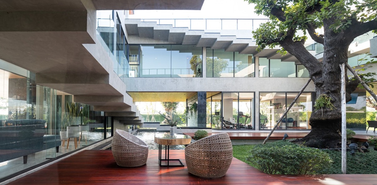 El diseño separa los programas de la casa en 3 espacios principales: interior, exterior y semiexterior. Los espacios semiexteriores son las zonas bajo los voladizos, que se aplica de la casa tradicional tailandesa. Estas tres categorías se consideran igual de importantes, y en este caso se han conectado hábilmente mediante el patio central, que es el corazón de esta casa.