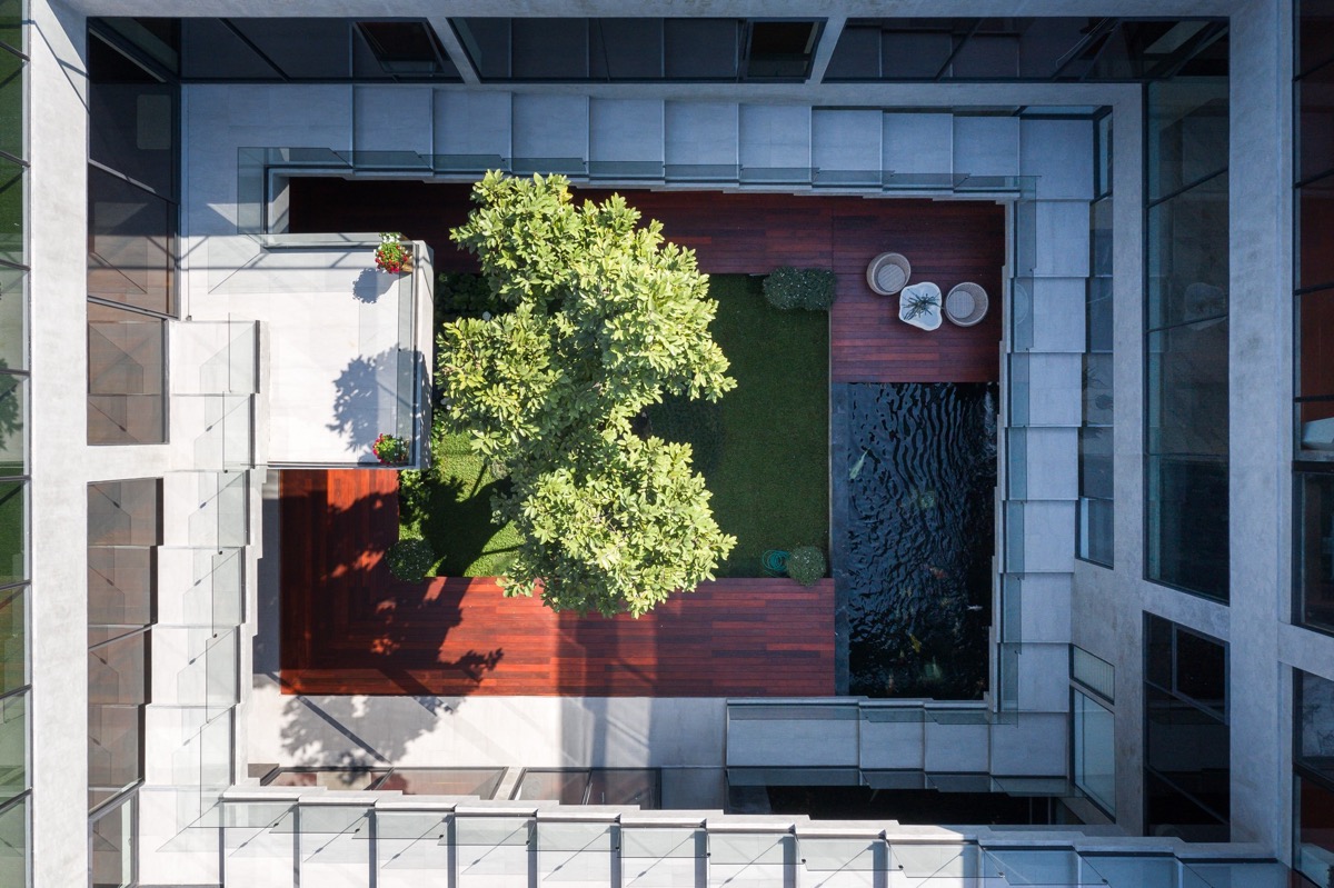 El voladizo arquitectónico sirve de marco a zonas de estar semiexteriores. La cubierta proporciona sombra y también actúa como un enorme vacío horizontal que puede aprovechar la luz natural y traer el viento refrescante al edificio y al patio.