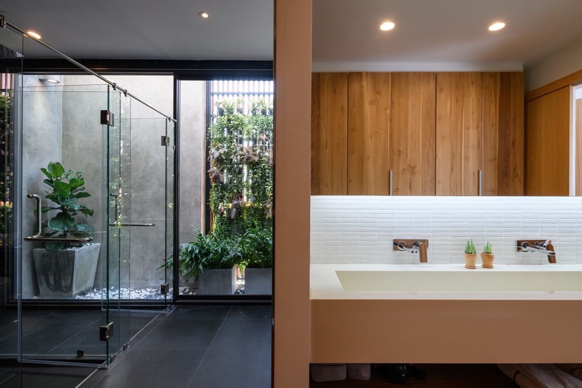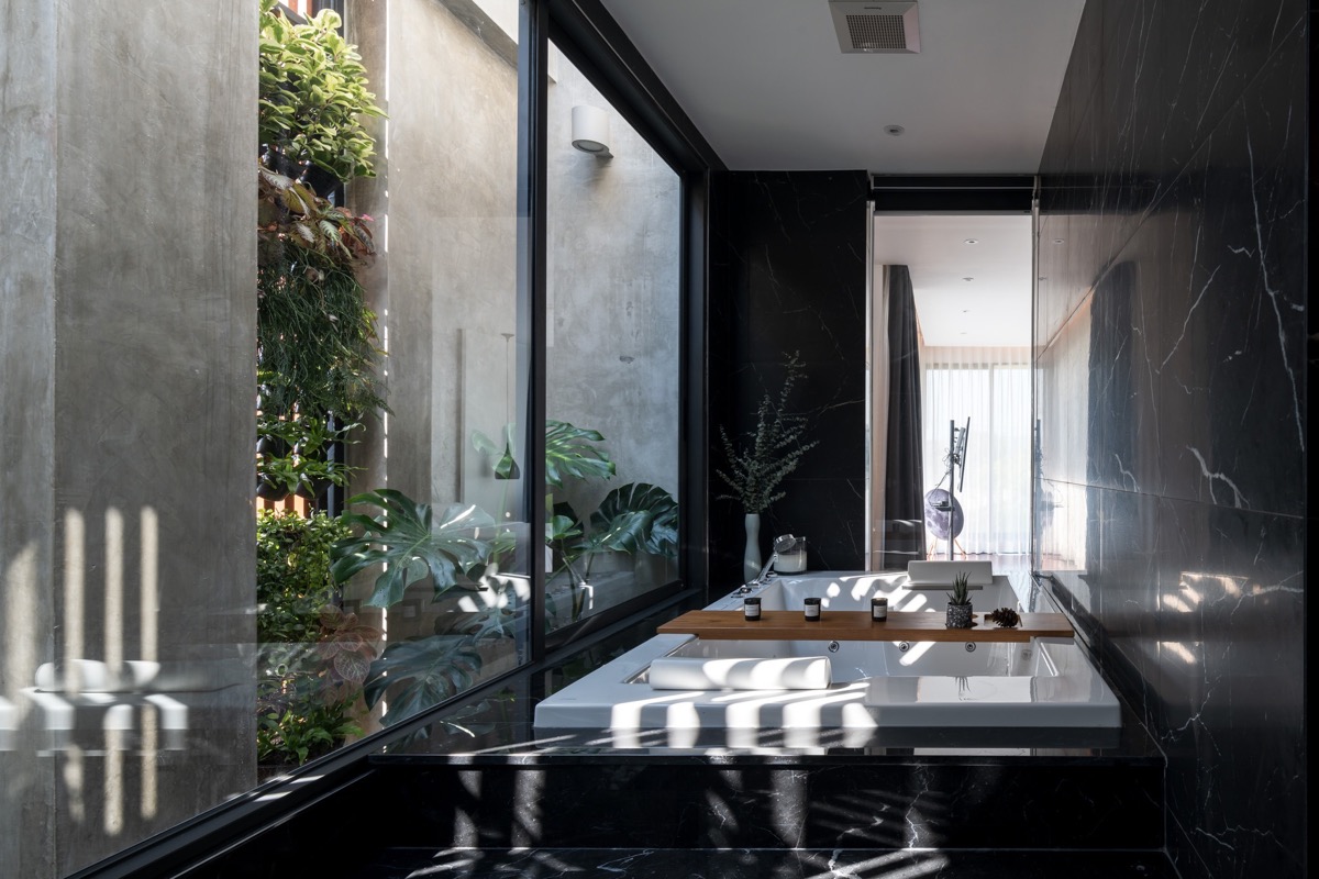 Las plantas verticales crean una atmósfera íntima junto a la bañera. Mientras que el hormigón en bruto y el estuco sencillo conforman la piel principal del edificio, el mármol, el granito y la madera se introducen para dar un acabado de alta gama.