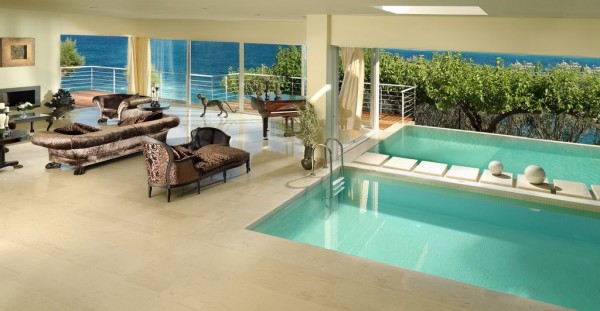 Dos piscinas cubiertas y al aire libre se encuentran en la sala de estar con piano y vistas al mar.