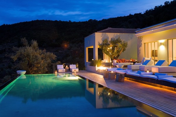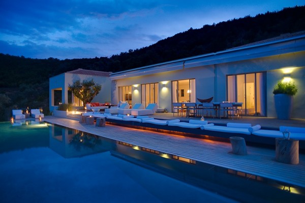 Varias terrazas se extienden desde las habitaciones principales y envuelven la estructura de la villa. Muchas luces ocultas iluminan la piscina y las zonas de pérgola.