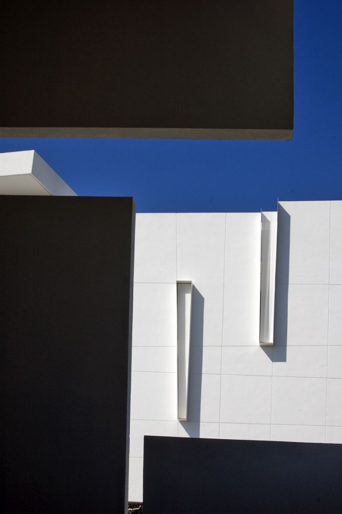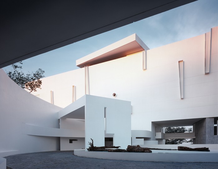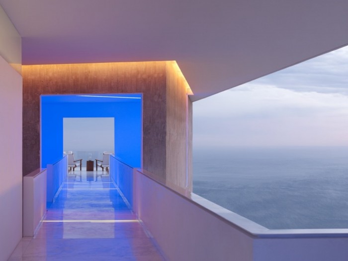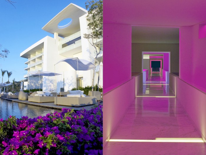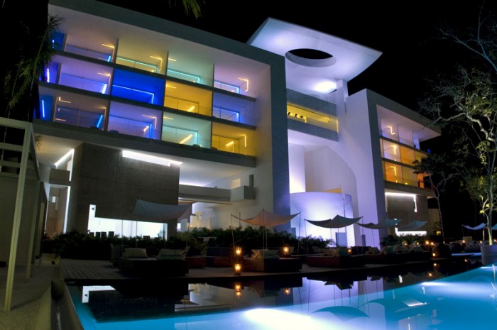La fachada exterior del hotel es de un blanco intenso que funciona a las mil maravillas como lienzo para la luz ambiental y las pantallas a todo color que se pueden encontrar en cada esquina.