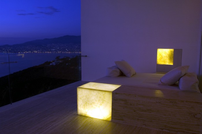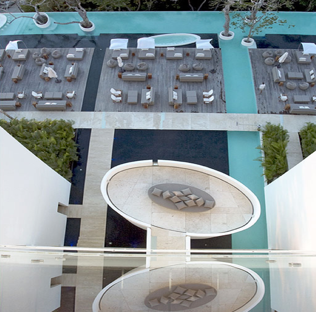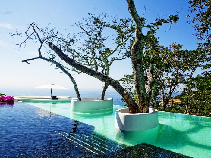 Esta piscina muestra el uso de la luz ambiental en tonos vibrantes incluso de día.