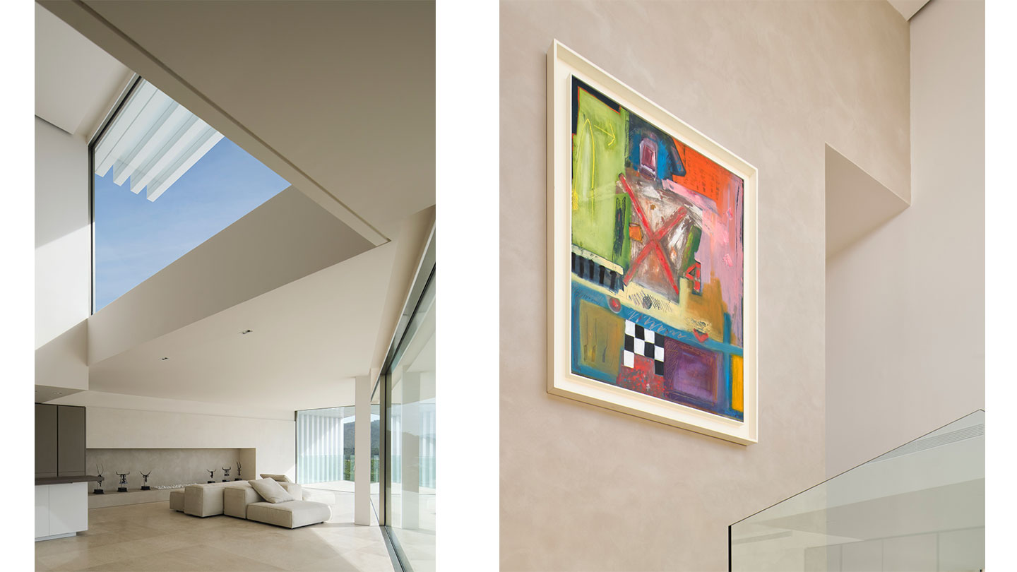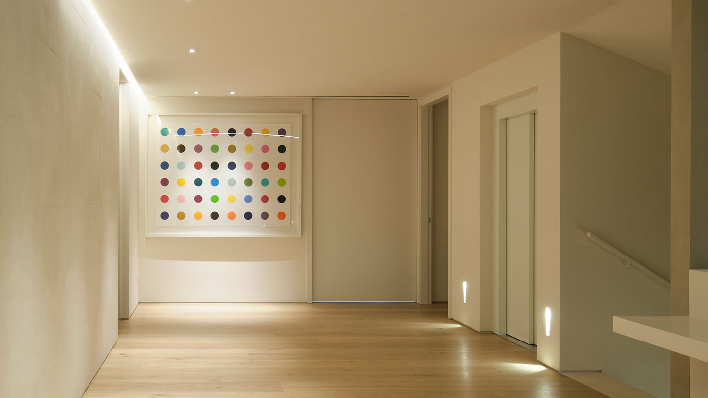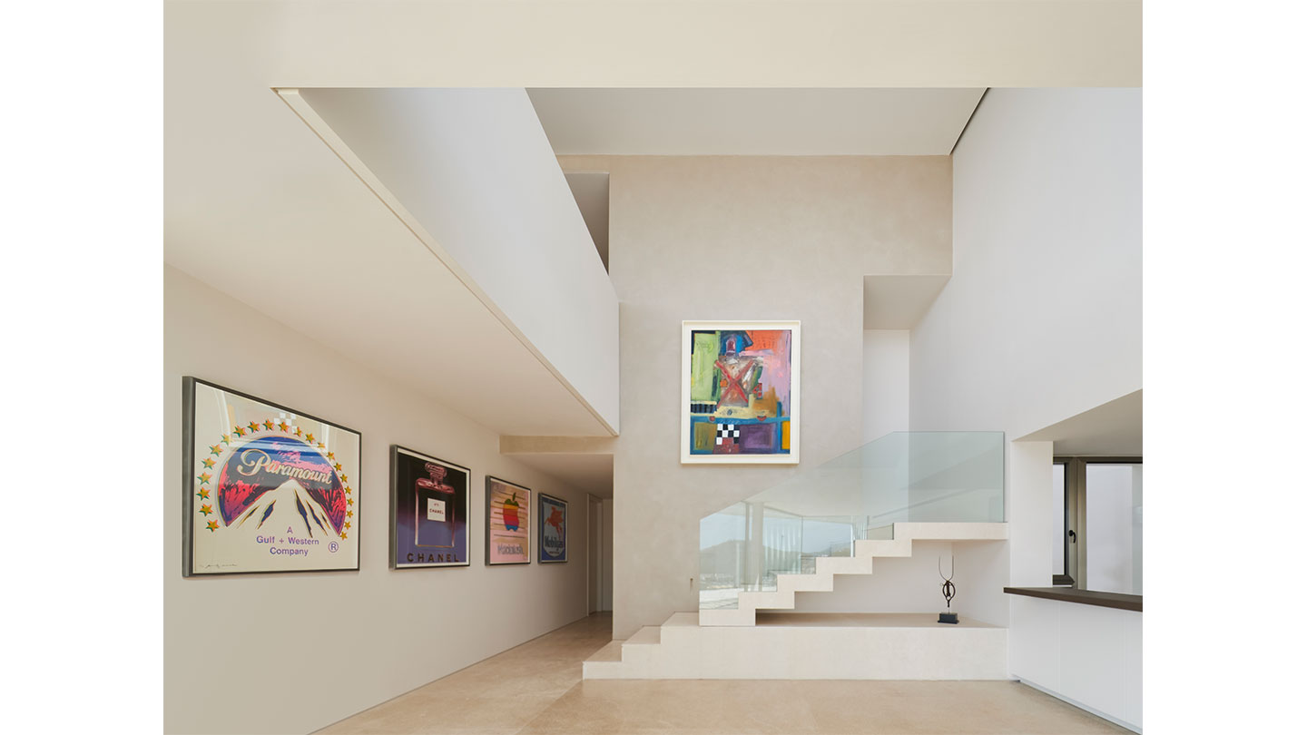 El lujo interior superior se materializa en un mobiliario moderno y elegante y un enfoque minimalista limpio. Paredes blancas, mucha luz y techos altos crean el espacio perfecto para una codiciada colección de obras contemporáneas de Damien Hirst, Andy Warhol y Banksy. Las obras de arte inyectan vivos estallidos de color en tres plantas de espacios fluidos que se abren al panorama.