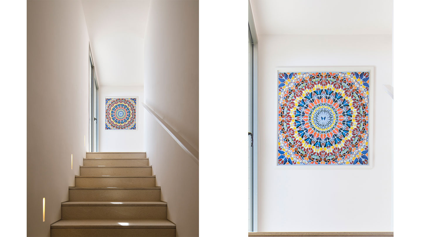 La obra de arte que atrae las miradas al final de la escalera es Kindness, 2011, de Damien Hirst.