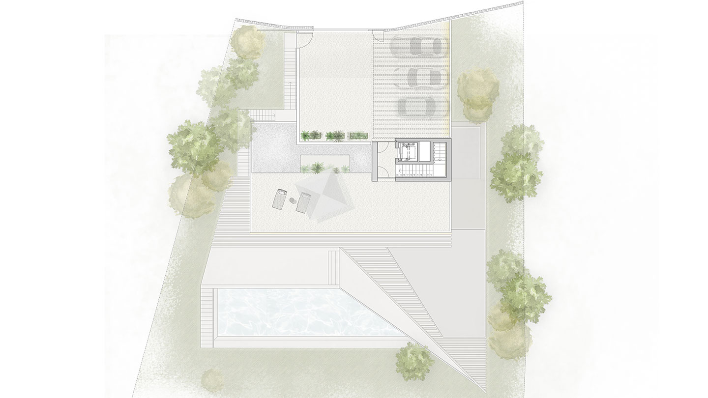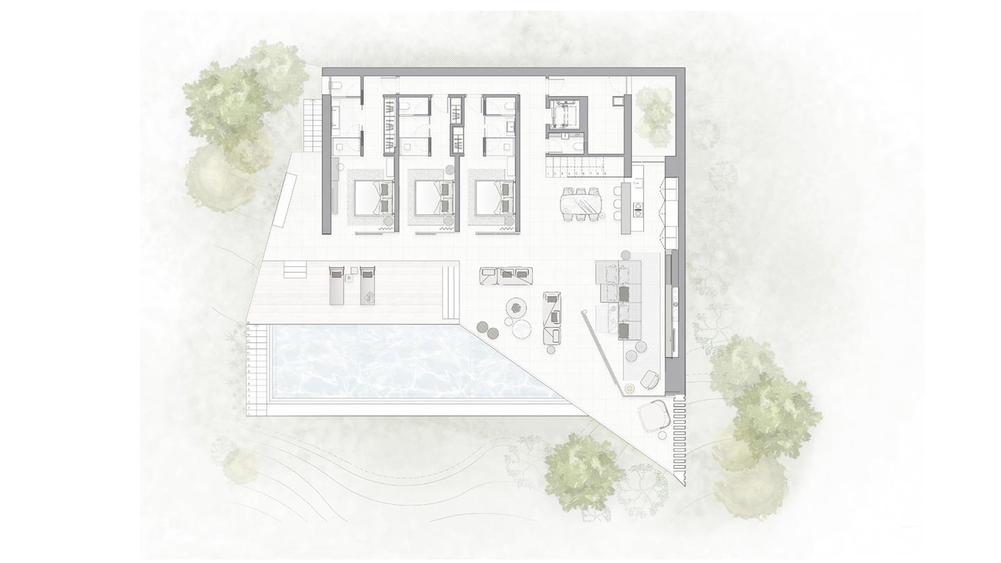 En la planta baja, podemos ver la escala uniforme de tres dormitorios dobles, cada uno con su propio cuarto de baño. Puertas correderas de cristal unifican los dormitorios con el espacio exterior y la piscina. También podemos observar la naturaleza angular de la sala de estar de planta abierta, que atraviesa la terraza solárium en voladizo. La planta baja de la villa se ha dividido por igual entre espacios interiores y exteriores, con paredes retráctiles que difuminan los límites.