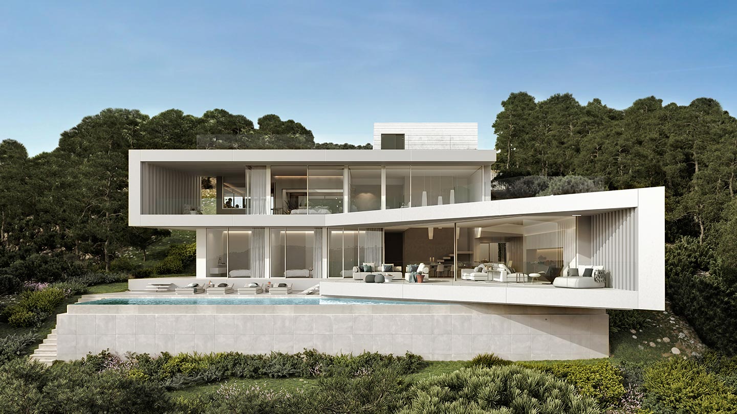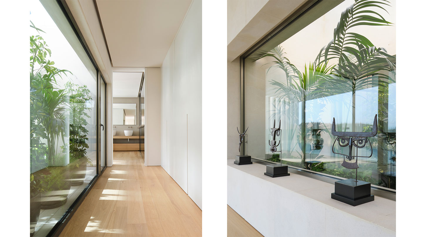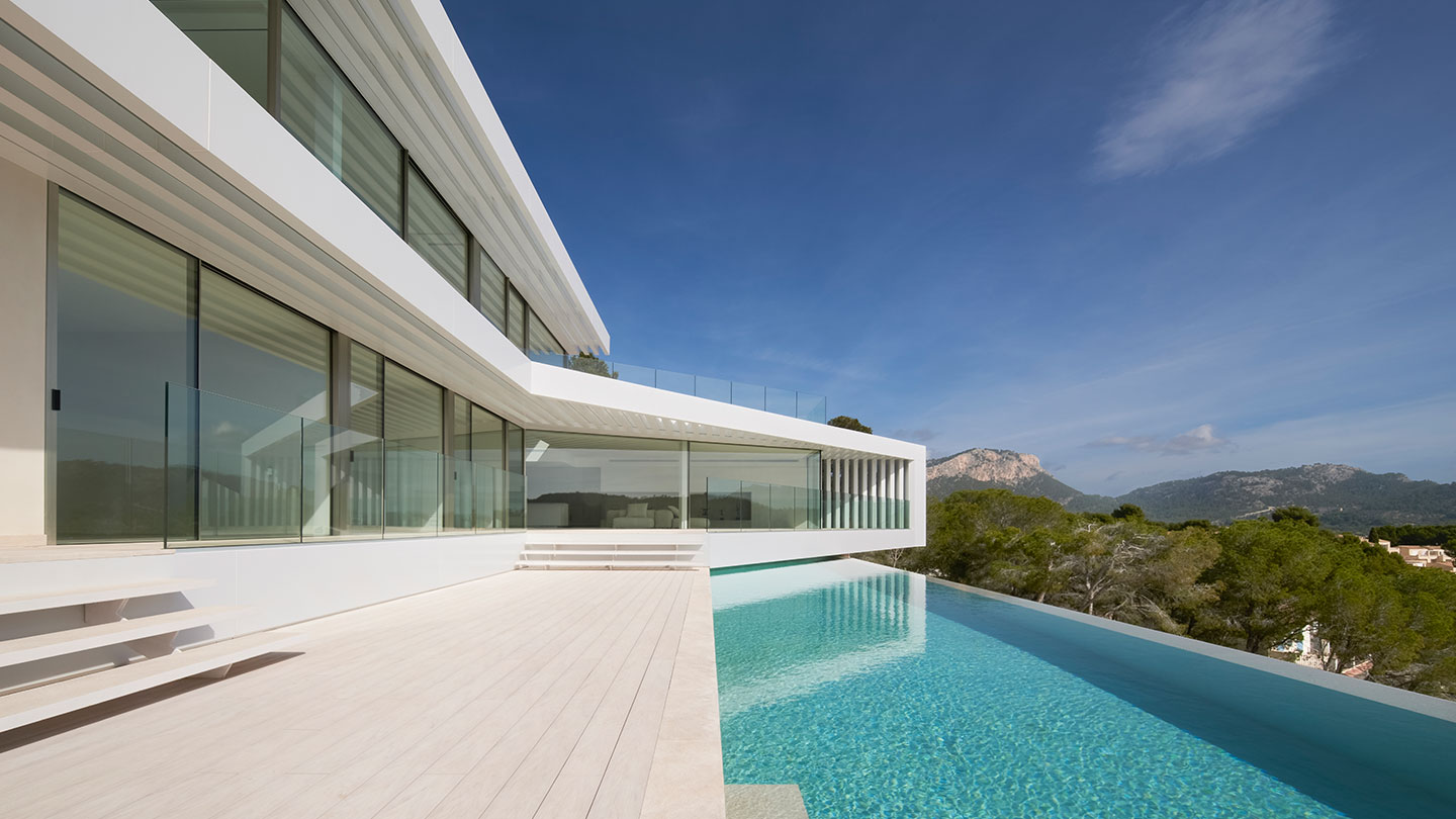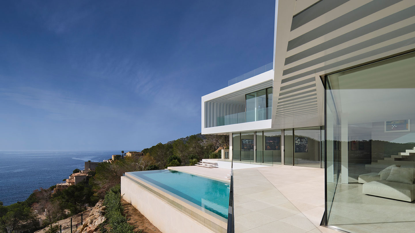 Unas balaustradas de cristal bordean de forma invisible una pasarela elevada que conduce a la villa desde la terraza de la piscina, dejando libres los amplios ventanales de la fachada.