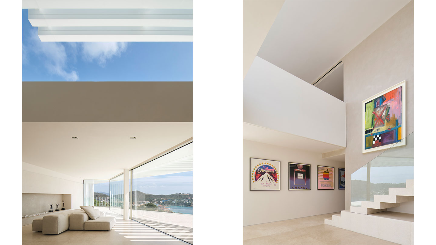 En la terraza de la piscina se ha dispuesto un salón exterior para aprovechar al máximo el excelente clima mediterráneo. Dentro de la lujosa villa, se despliega una sala de estar interior con un salón de doble cara y un comedor formal. Cuatro grandes lámparas colgantes de comedor descienden desde la impresionante altura del techo en el centro del espacio, donde más cielos azules atraviesan la estructura de hormigón blanco.