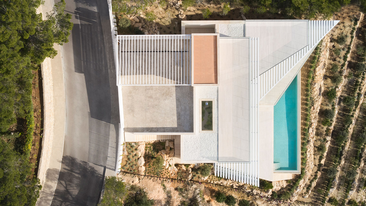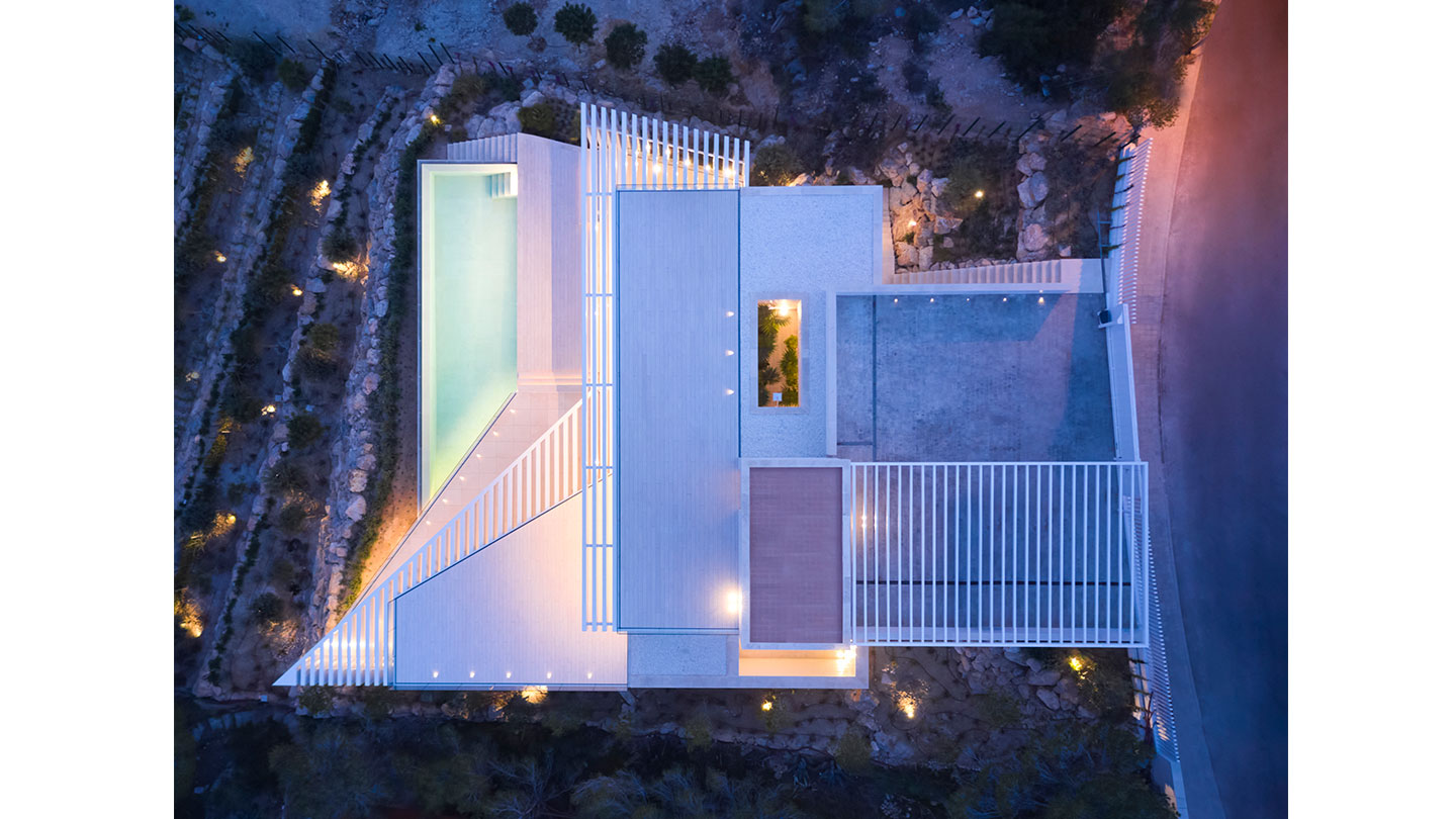 La arquitectura geométrica de Villa Anguli se proyecta en un ángulo oblicuo agudo desde su base edificada en la ladera. Esta forma irregular permite a la villa absorber las gloriosas vistas al mar a través de toda la anchura de su elegante fachada de cristal.