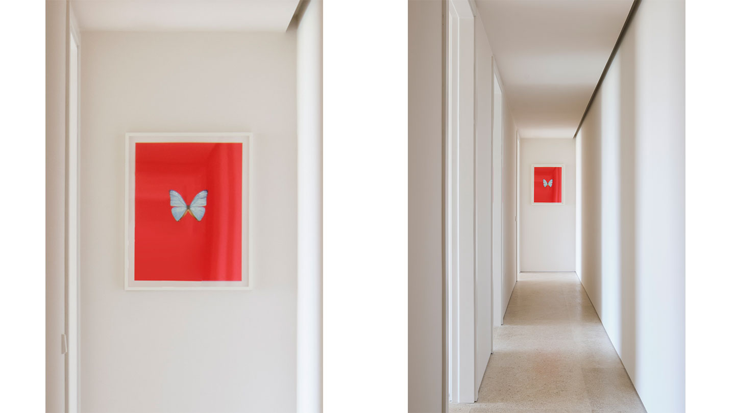 Otro derroche de color eleva la entrada blanca a la suite principal. Encuentre los cuadros de Damien Hirst aquí.