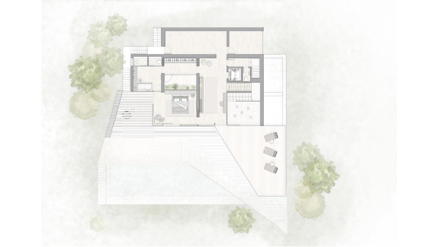 El plano de la planta superior ilustra en detalle la suite principal. El dormitorio está situado justo en la parte delantera de la villa, junto a las vistas. El dormitorio también comunica con su propia terraza solárium, dispuesta sobre el ángulo oblicuo del salón inferior.
