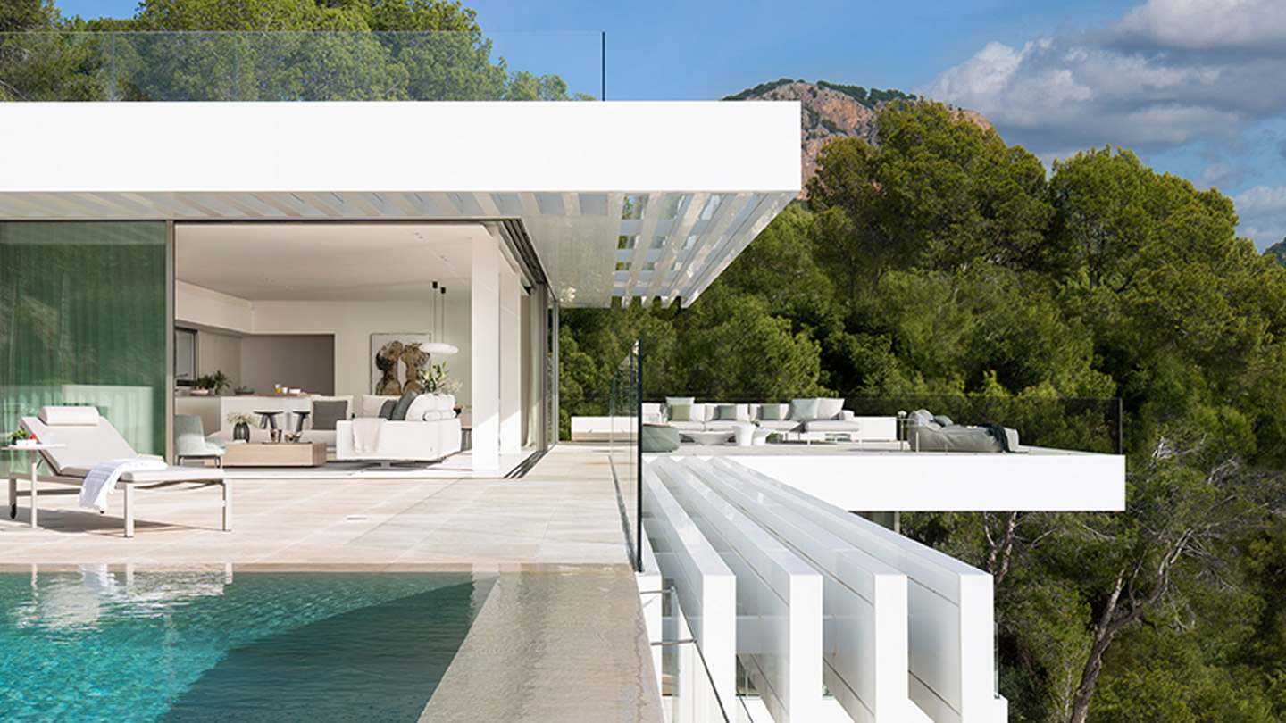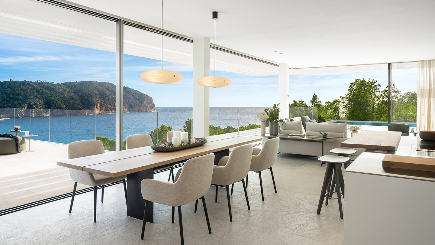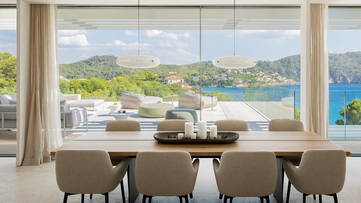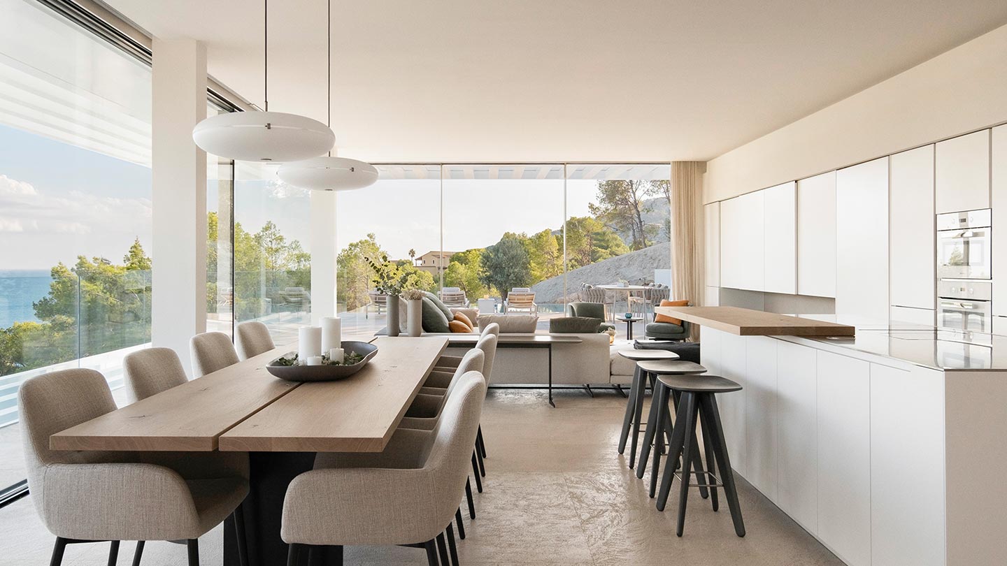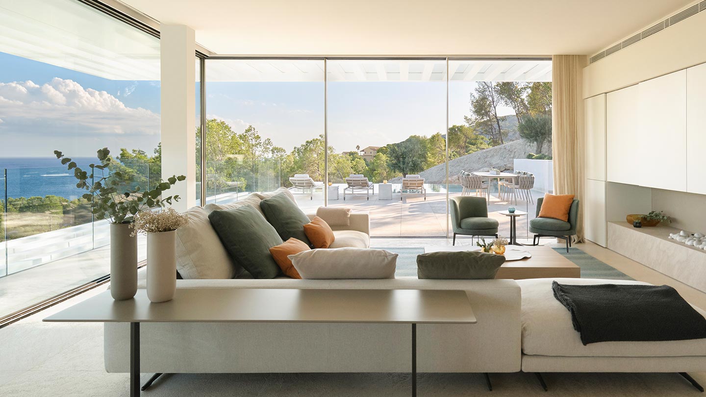 El fresco diseño interior de Villa Statera, creado por Terraza Balear, es un concepto limpio de linealidad que complementa la arquitectura de la casa. La decoración se ejecuta en una paleta natural que se funde con el entorno de la morada junto a la playa e incorpora marcas de alta gama como B&B Italia, y una cocina de diseño de Poliform.