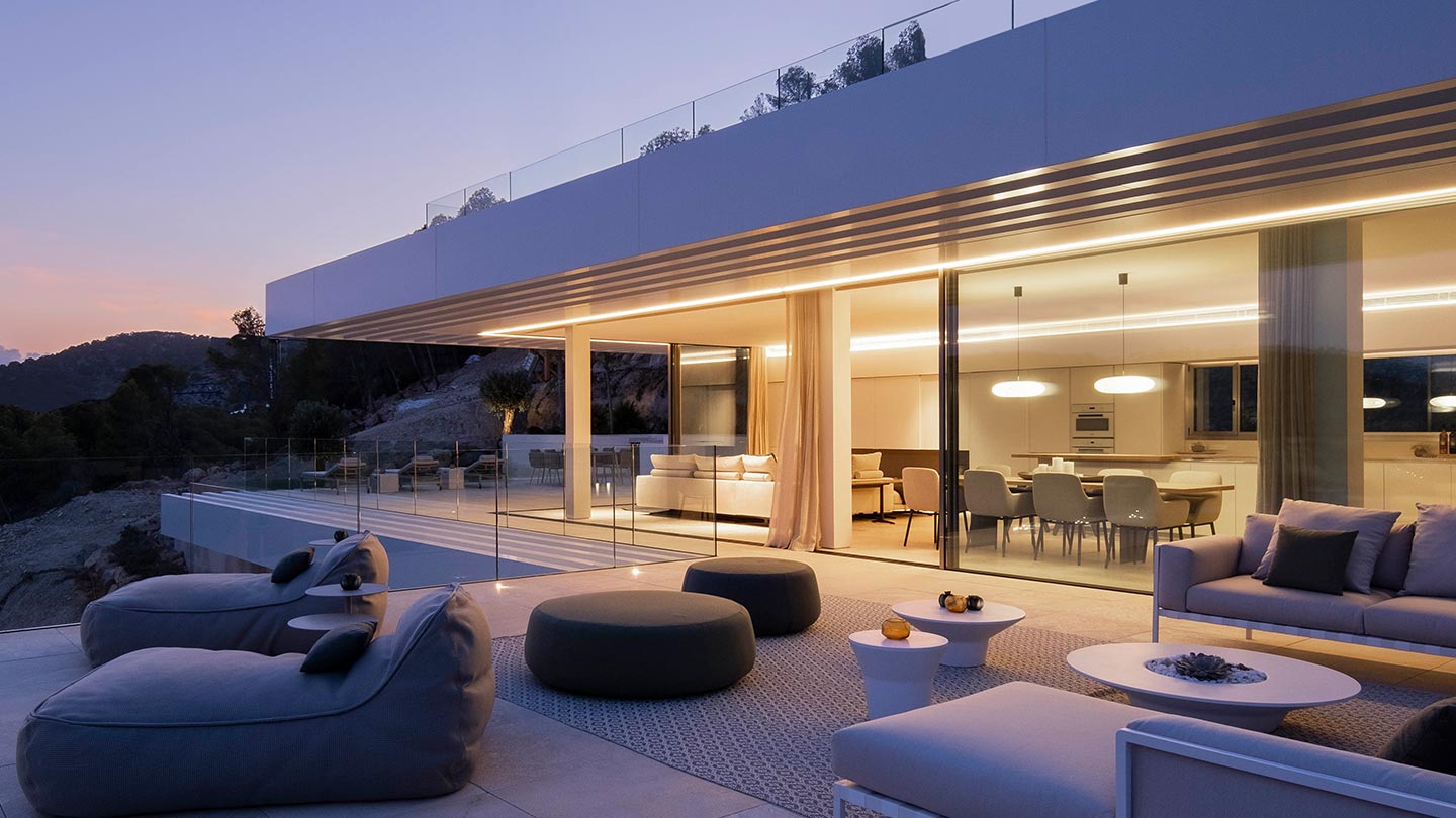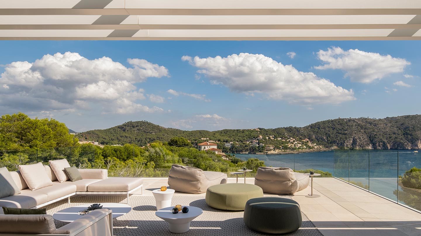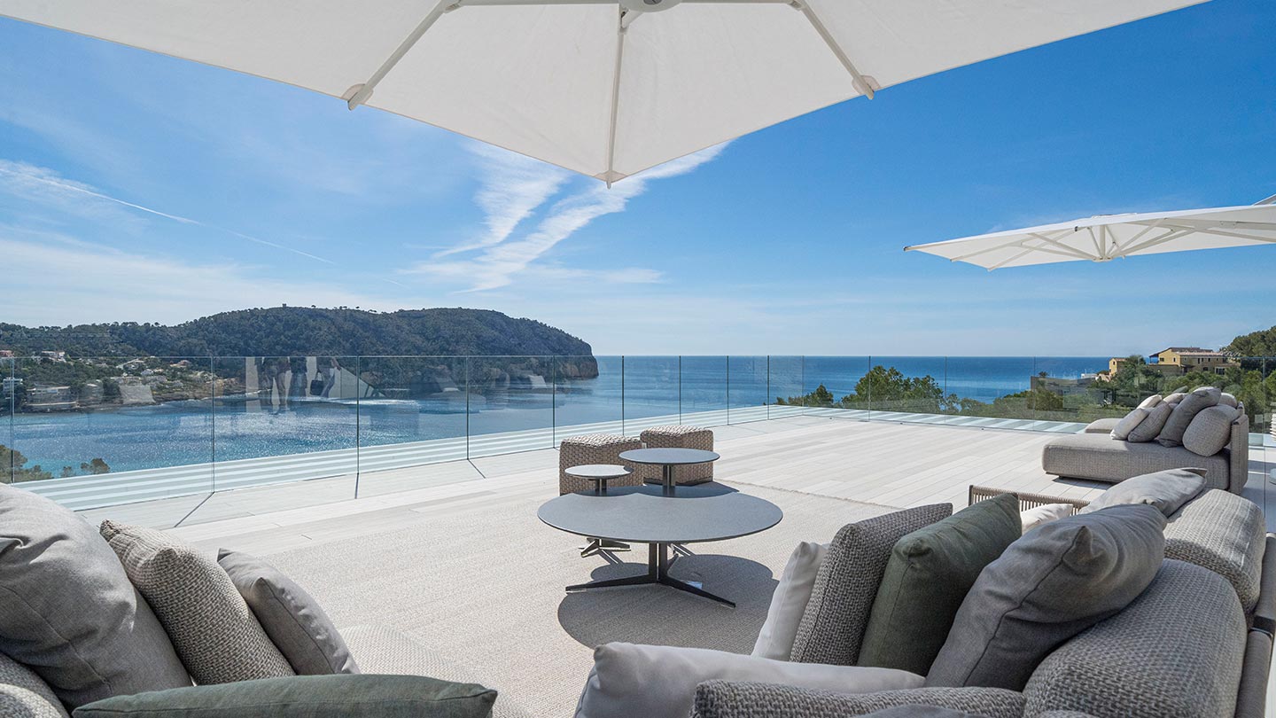 Unos lujosos sofás al aire libre ofrecen unas vistas de ensueño al mar abierto y al cabo Andritxol, que se ilumina al caer la noche.