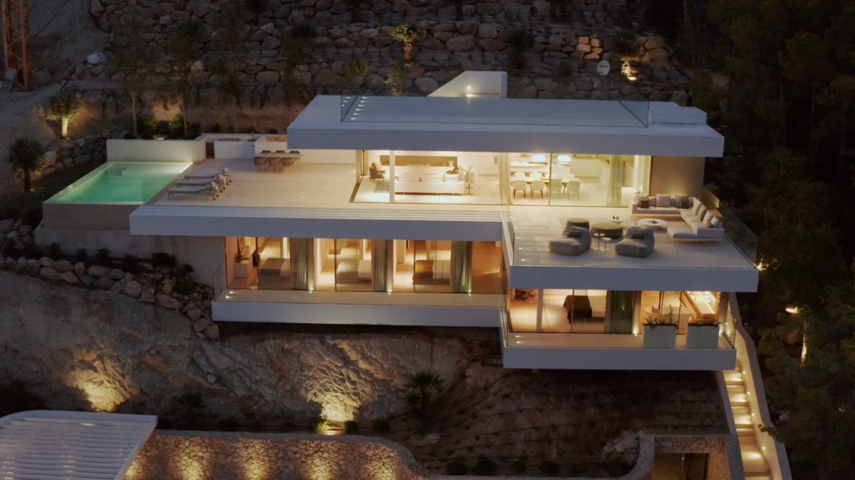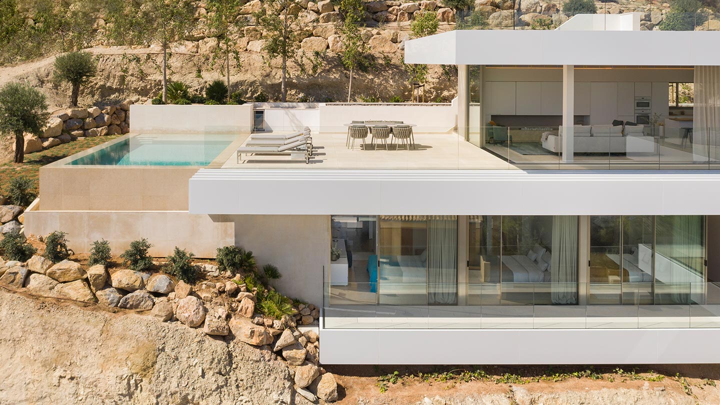 En una parcela elevada orientada al sur de más de 1.000 metros cuadrados, esta magnífica propiedad moderna está excavada en la pared rocosa de Camp de Mar, Mallorca, España. Diseñada por E5 Holding, la villa tiene una superficie construida de 394 metros cuadrados en dos niveles.