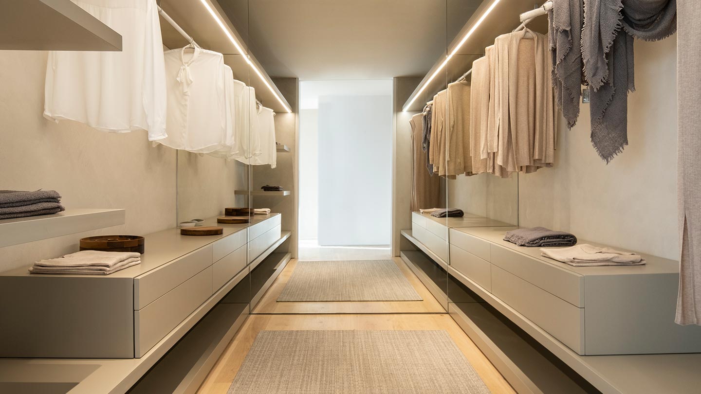 El dormitorio principal también cuenta con un enorme vestidor con un elegante sistema de almacenamiento y un espejo vestidor a medida que va del suelo al techo.