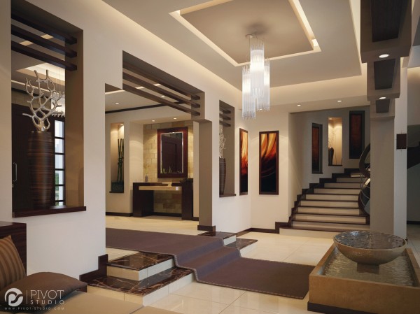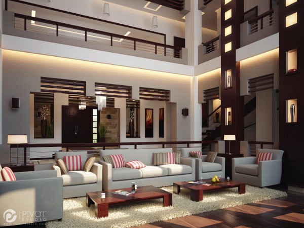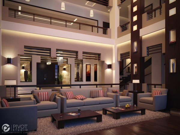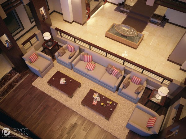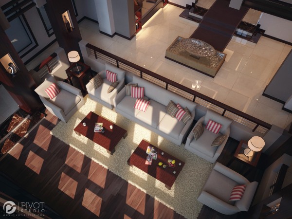 La zona de entrada impresiona con una triple altura en los asientos, aunque podría ser un espacio con eco y corrientes de aire en términos prácticos. Esta entrada fluye hacia una amplia escalera de líneas suaves y un vestíbulo con suelos reflectantes que devuelven el cálido resplandor de la iluminación al espacio. Una enorme alfombra conecta diferentes áreas de asientos y mesas, unificando la gran sala en un solo conjunto armonioso.