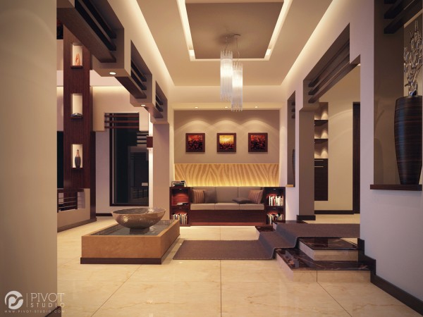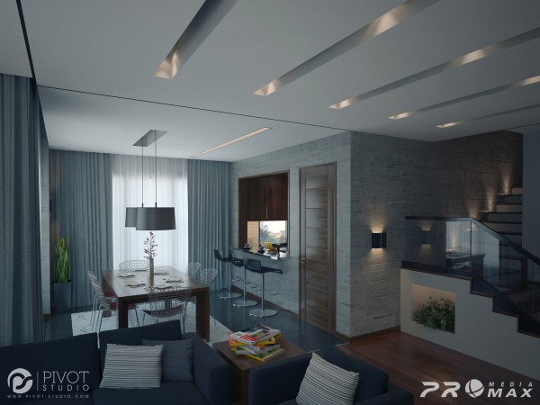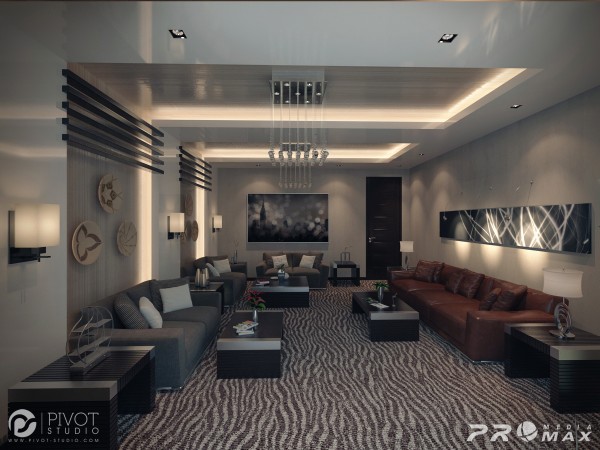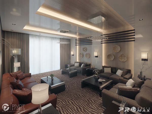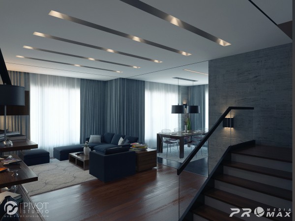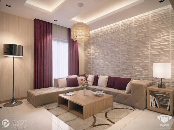 Los pozos de luz empotrados proyectan un suave resplandor que realza la textura ondulante de la pared detrás del sofá, mientras que un resplandor perimetral acentúa el ambiente. Como pieza decorativa principal, una elegante lámpara colgante se convierte en el centro de atención.