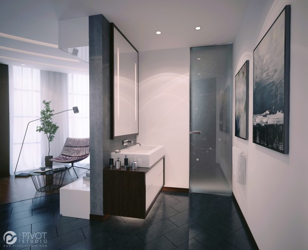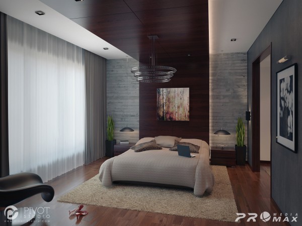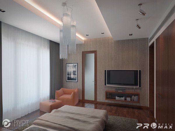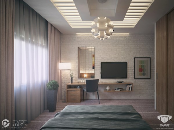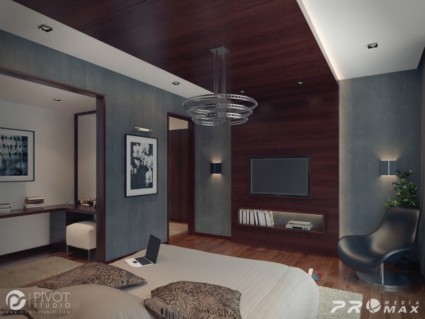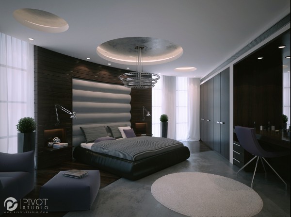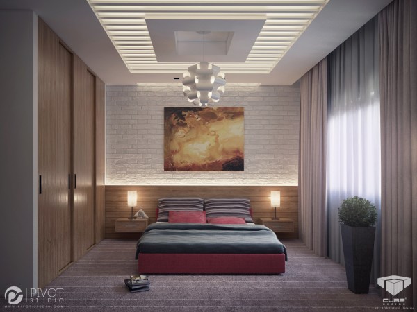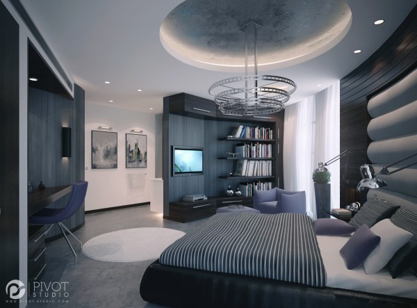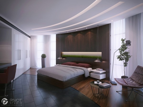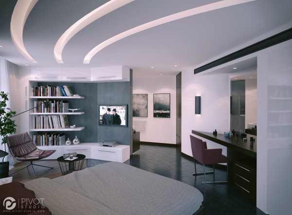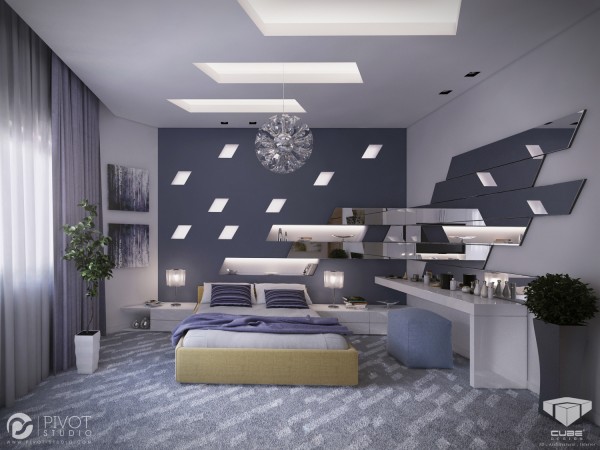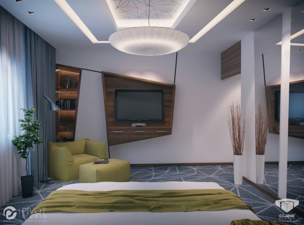Una visión geométrica más atrevida destaca en otra habitación, donde los ángulos inclinados del suelo se elevan hacia un cabecero iluminado y se extienden hasta los armarios sobre la cama. Incluso el techo y la unidad de entretenimiento reflejan este enfoque artístico, logrando una estética cohesiva y moderna.
