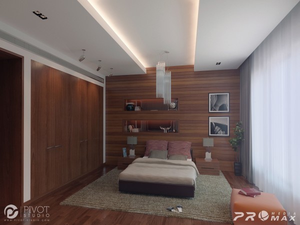En el dormitorio, los cortes geométricos del cabecero encuentran eco en la alfombra, las luces del techo y los espejos del tocador, creando una conexión visual con las estanterías empotradas cercanas. Otro dormitorio presenta un enfoque más suave, donde la luz se filtra a través de un diseño de persiana en el techo, creando un ambiente sereno y acogedor. El tocador, por su parte, combina diseño y practicidad al pasar de una pieza independiente a un retorno montado en la pared.
