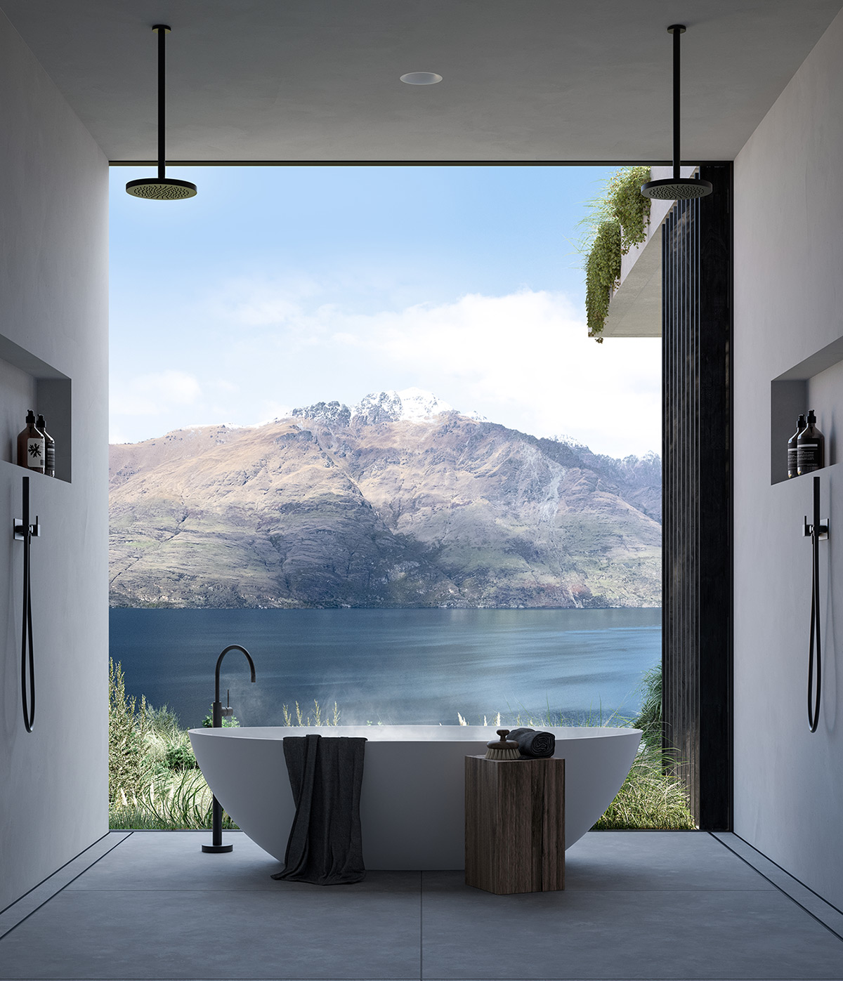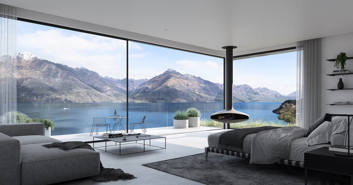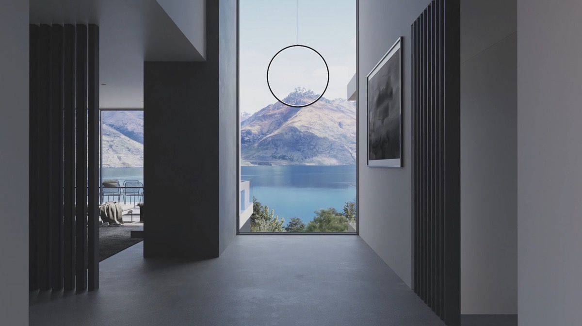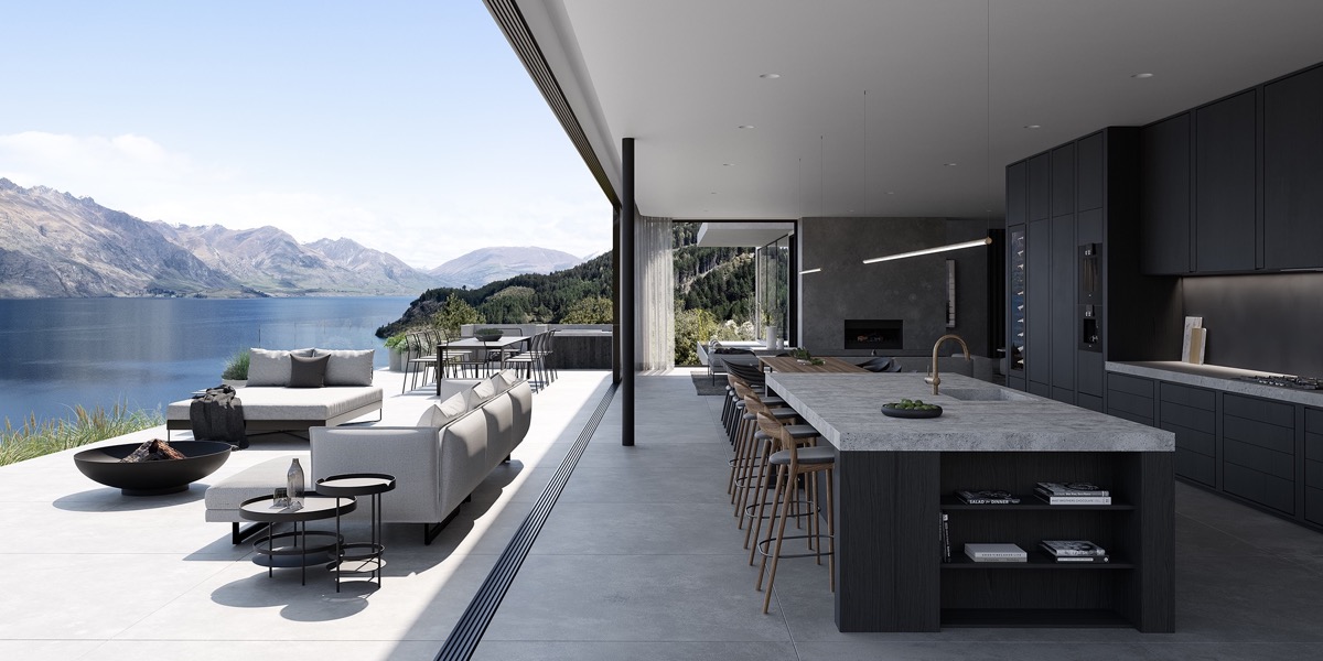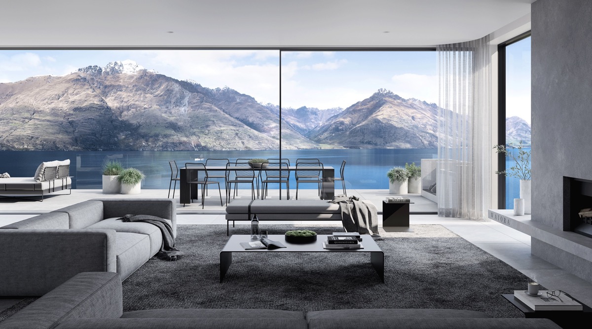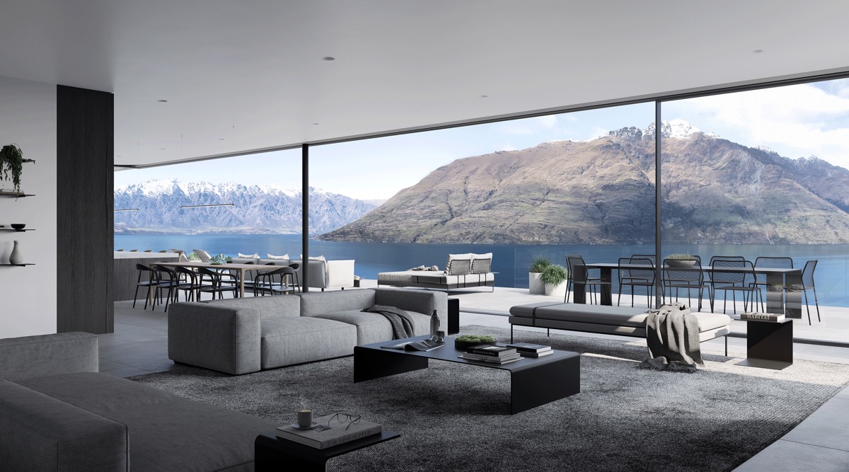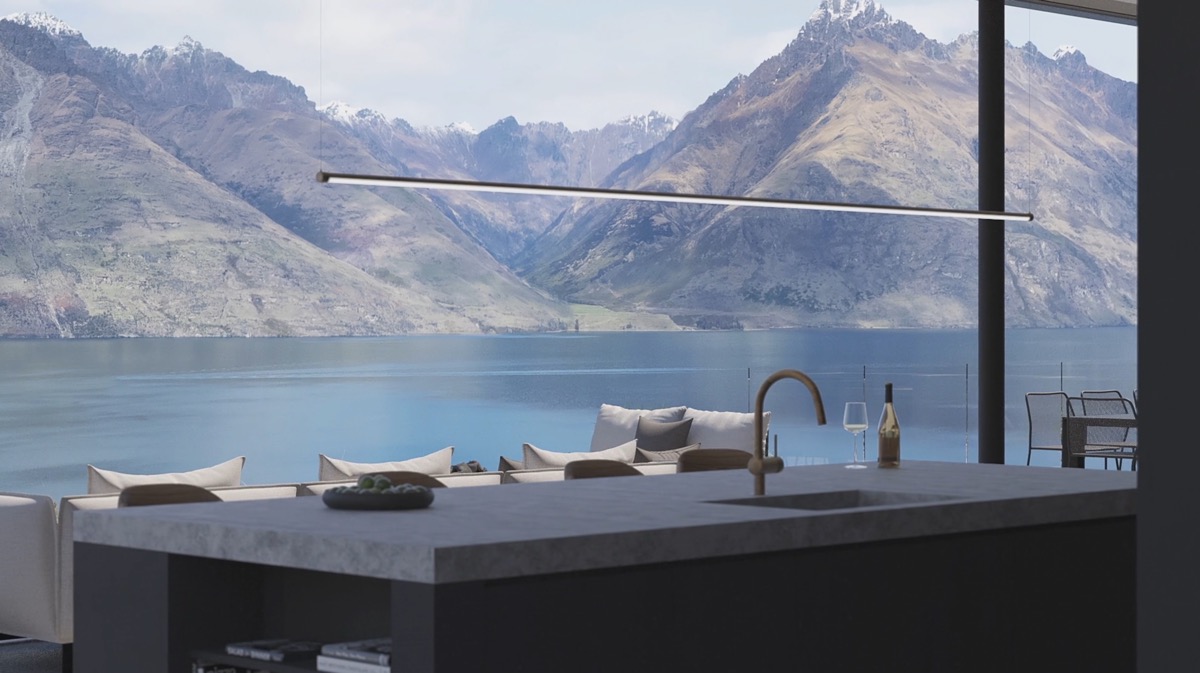 Al entrar en la exquisita casa, una vista imposiblemente perfecta causa un primer impacto impresionante. Las cristalinas aguas azules del lago Wakatipu evocan la calma, mientras que el pico Cecil y las cordilleras Remarkable despiertan asombro y maravilla.