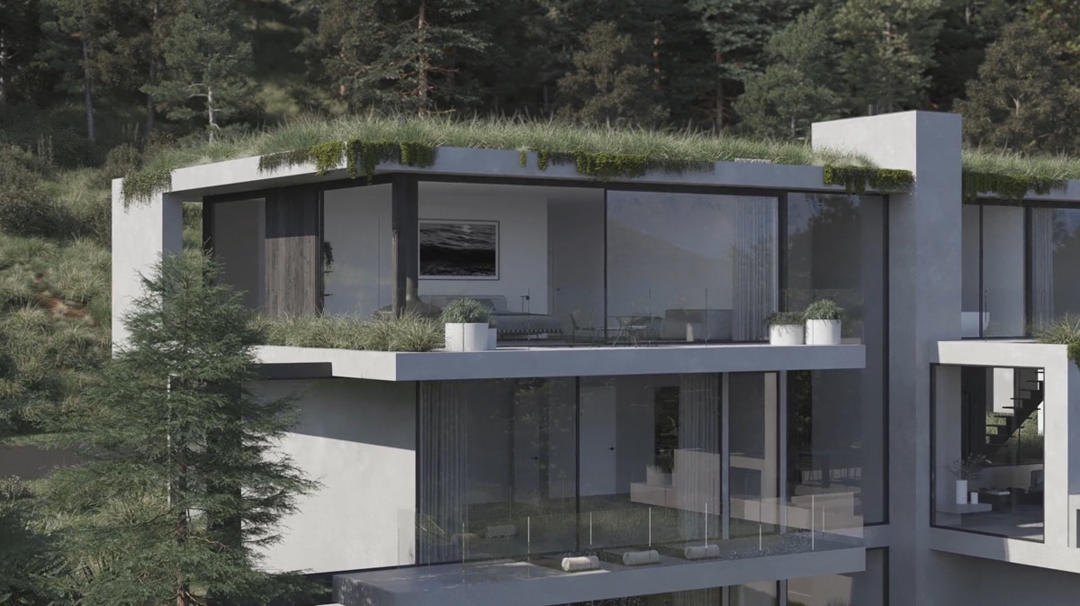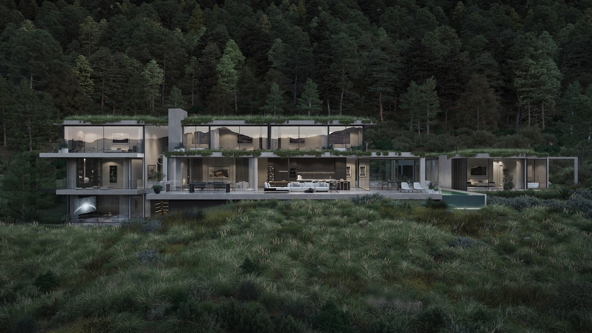 Incluso el tejado de la casa está invadido por la belleza verde de la naturaleza. El tejado verde se integra armoniosamente en la colina, suavizando la presencia de la arquitectura lineal.