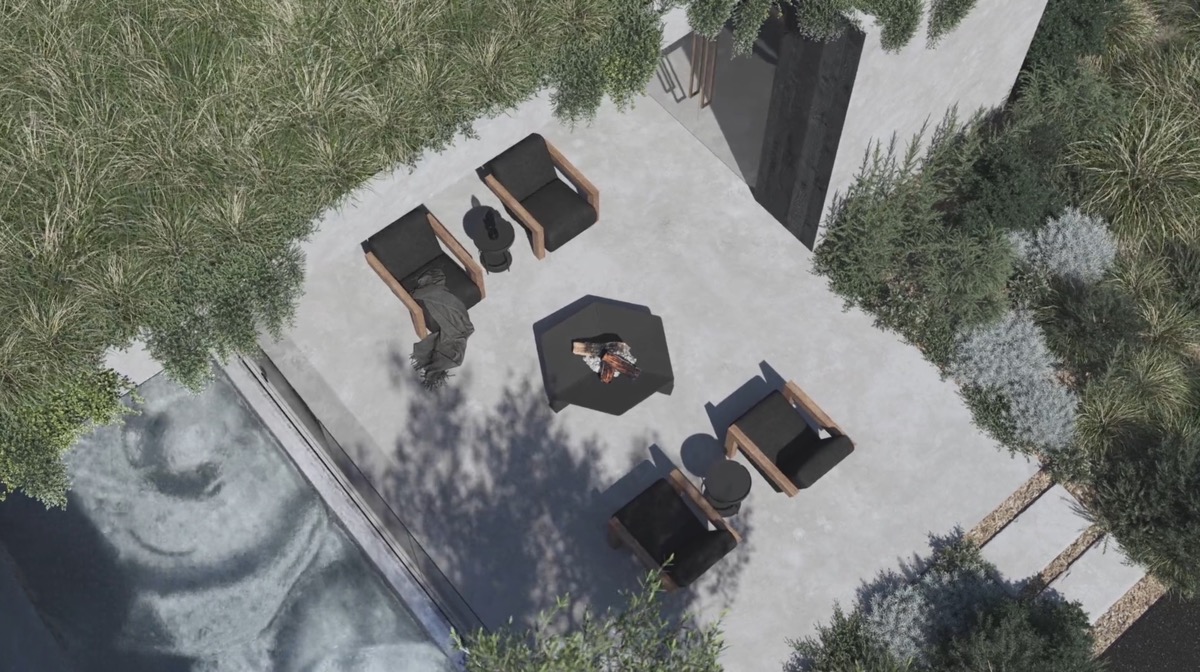 Un patio más amplio bordea la piscina infinita. Cuatro tumbonas de exterior y una moderna hoguera conforman una acogedora zona social, donde las conversaciones y las risas pueden prolongarse hasta bien entrada la noche. Ver más sillas negras.