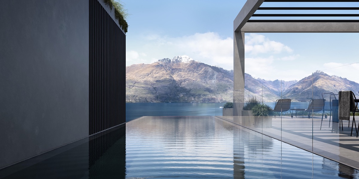 Las aguas de la piscina infinita ondulan hacia el lago Wakatipu y las cordilleras cercanas.
