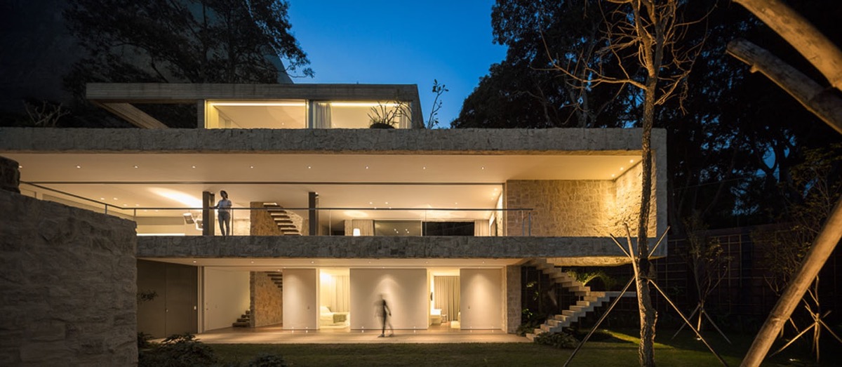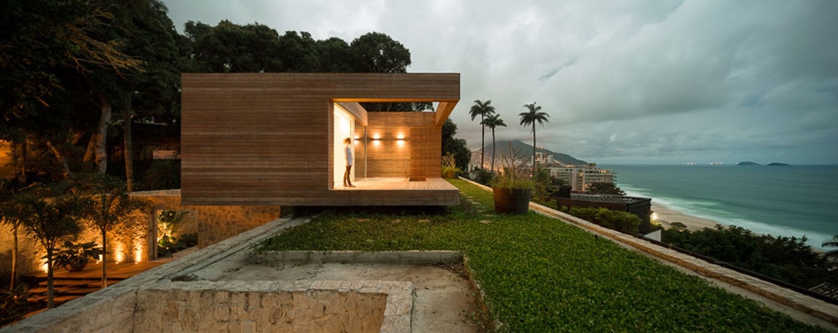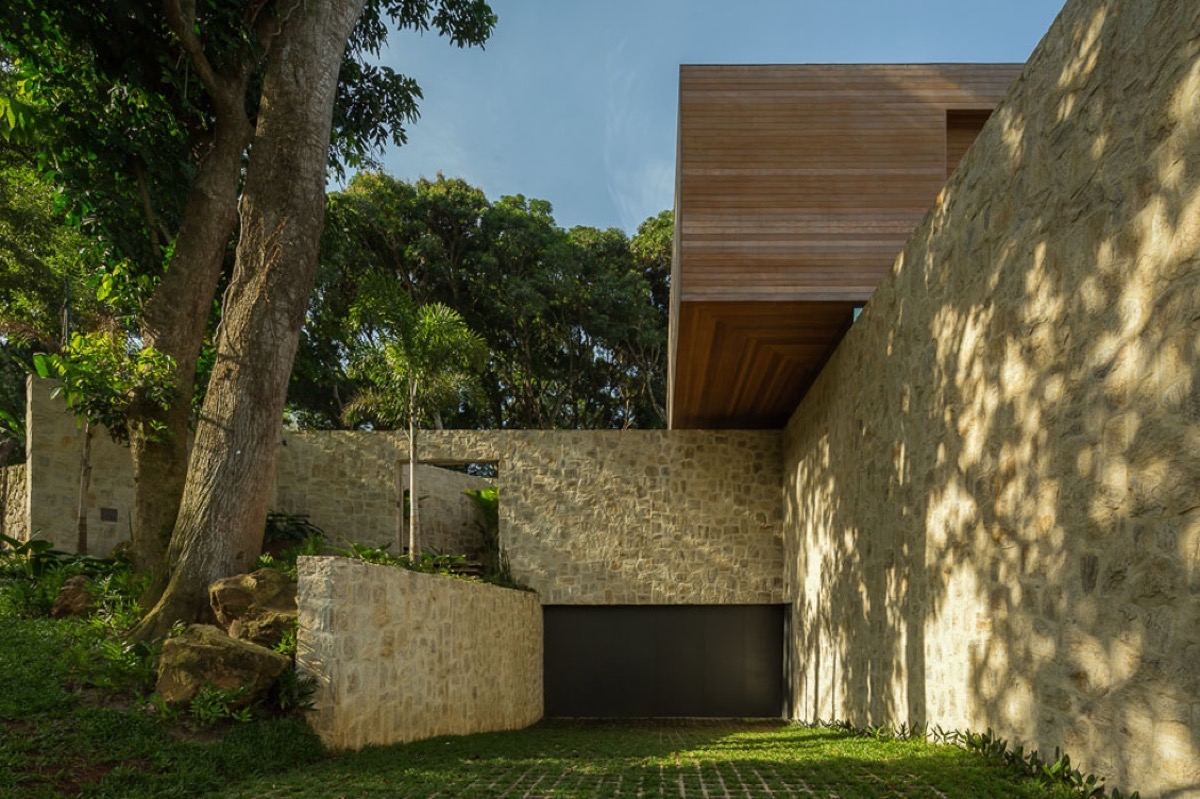 El dormitorio de madera da a la entrada principal de la casa. Un enorme muro de piedra protege la casa de la mirada pública. El arquitecto Arthur Casas levantó los cimientos para que la casa de abajo quedara oculta a la vista.