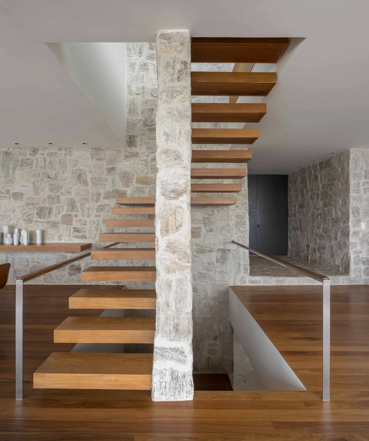 Una escalera abierta conduce a la suite principal. Los peldaños de madera sobresalen de su soporte de piedra en la pared, donde se esconde un pasamanos empotrado.