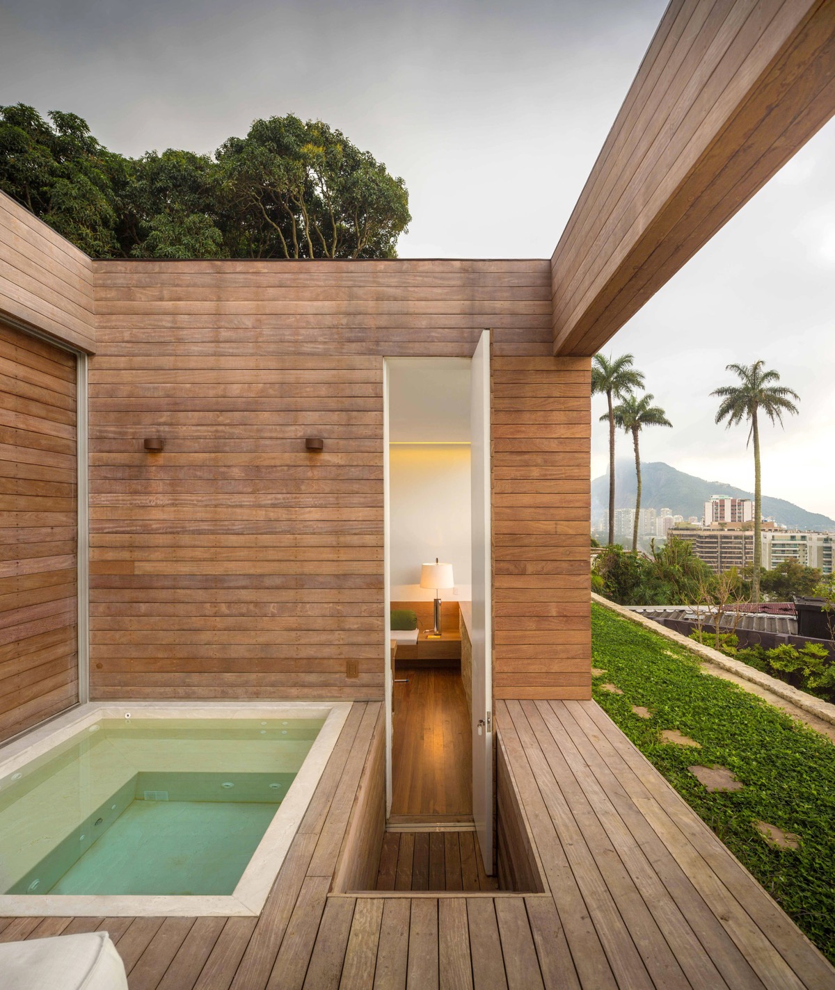 Hay una bañera de hidromasaje sumergida en el suelo del volumen revestido de madera, donde una alta puerta de casi 3 metros de altura conduce directamente al dormitorio principal.