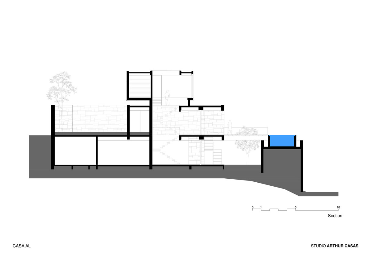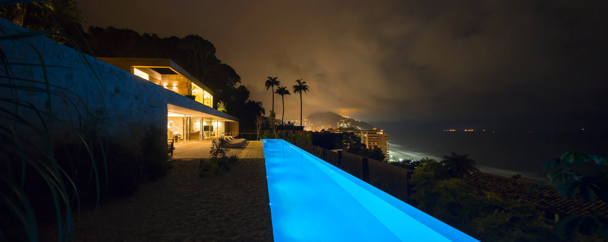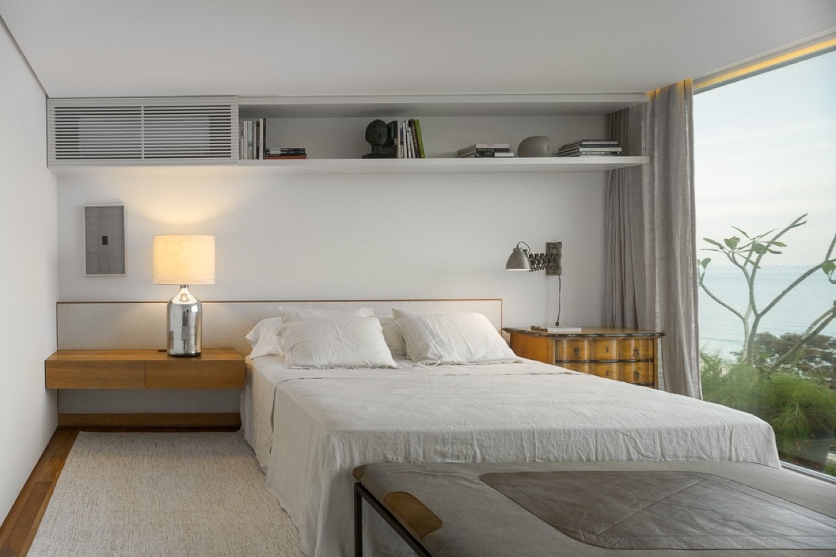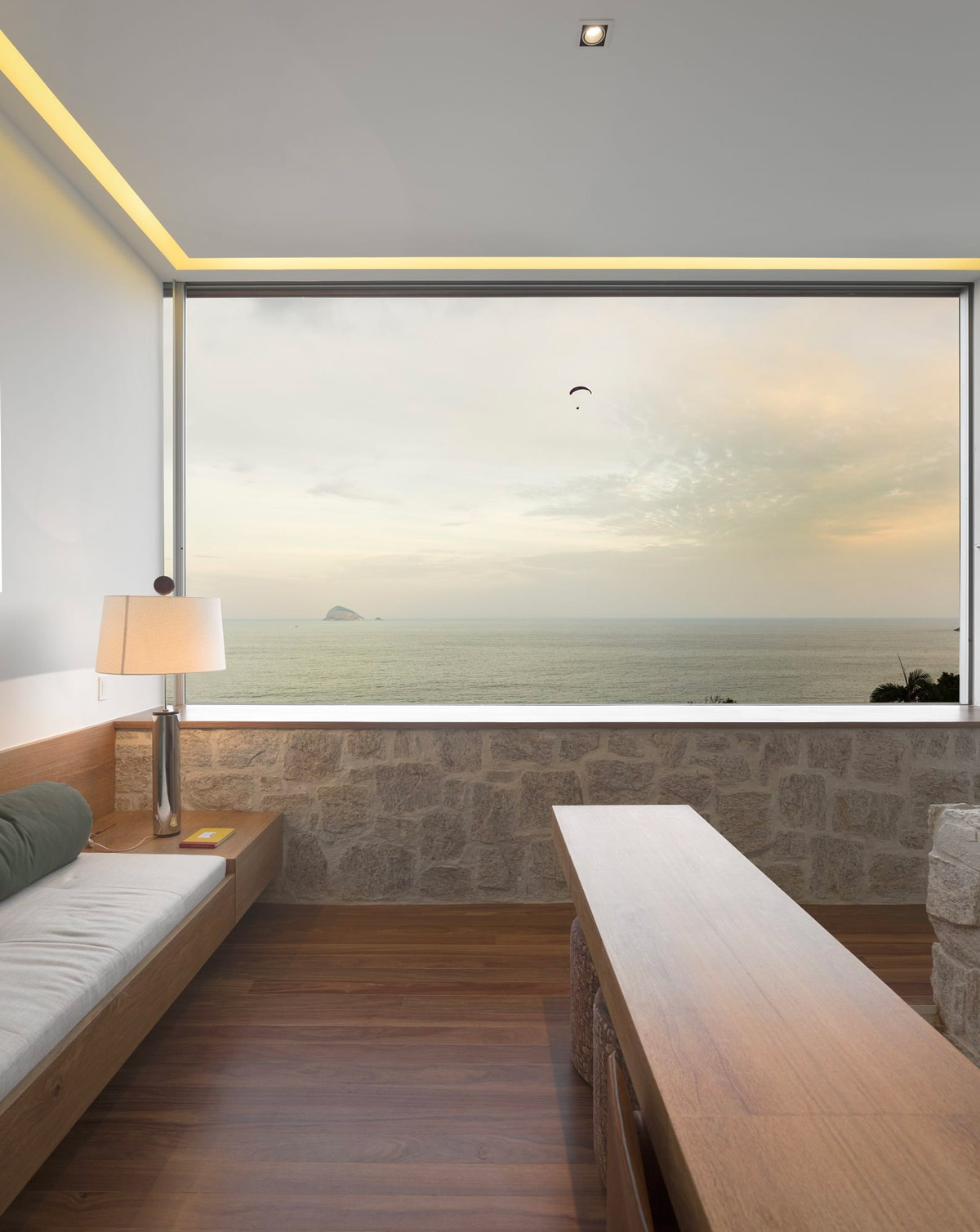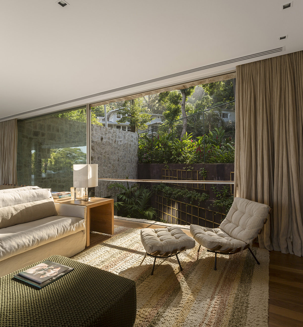 Los arquitectos del Studio Arthur Casas empezaron a trabajar en el diseño en cuanto eligieron la parcela. Optimizar las vistas al mar era primordial, por supuesto, así que el espacio principal de la casa tenía que estar elevado, liberado de los altos muros que rodeaban la parcela triangular. El paisaje se convirtió en parte viva del diseño de la casa, desestabilizando la percepción del interior y el exterior.