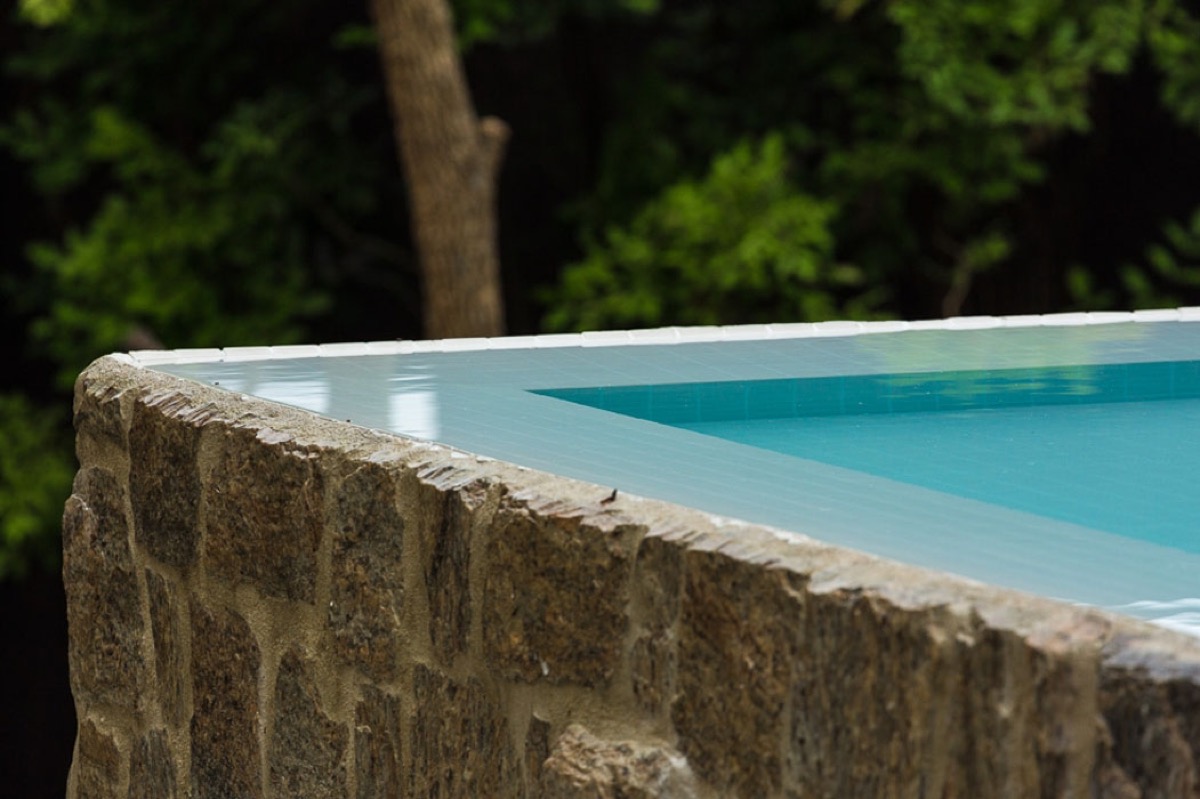 Los muros de piedra y la madera natural se unen en armonioso matrimonio. El agua azul de una piscina infinita brilla bajo un cielo azul despejado.
