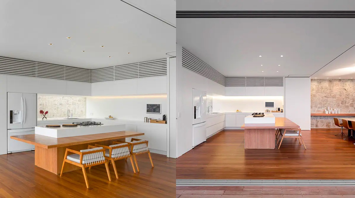El interior de la casa está decorado predominantemente en blanco y tonos claros de madera para lograr la estética limpia deseada.