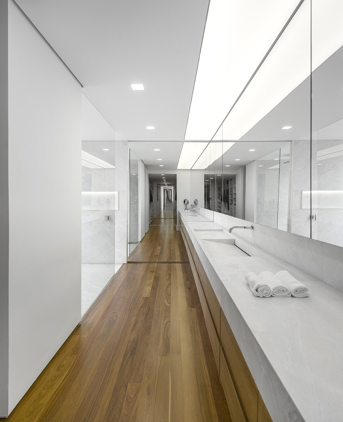 El lujoso cuarto de baño parece extenderse a lo largo de kilómetros gracias a la inteligente colocación de un espejo sin marco cortado a medida.