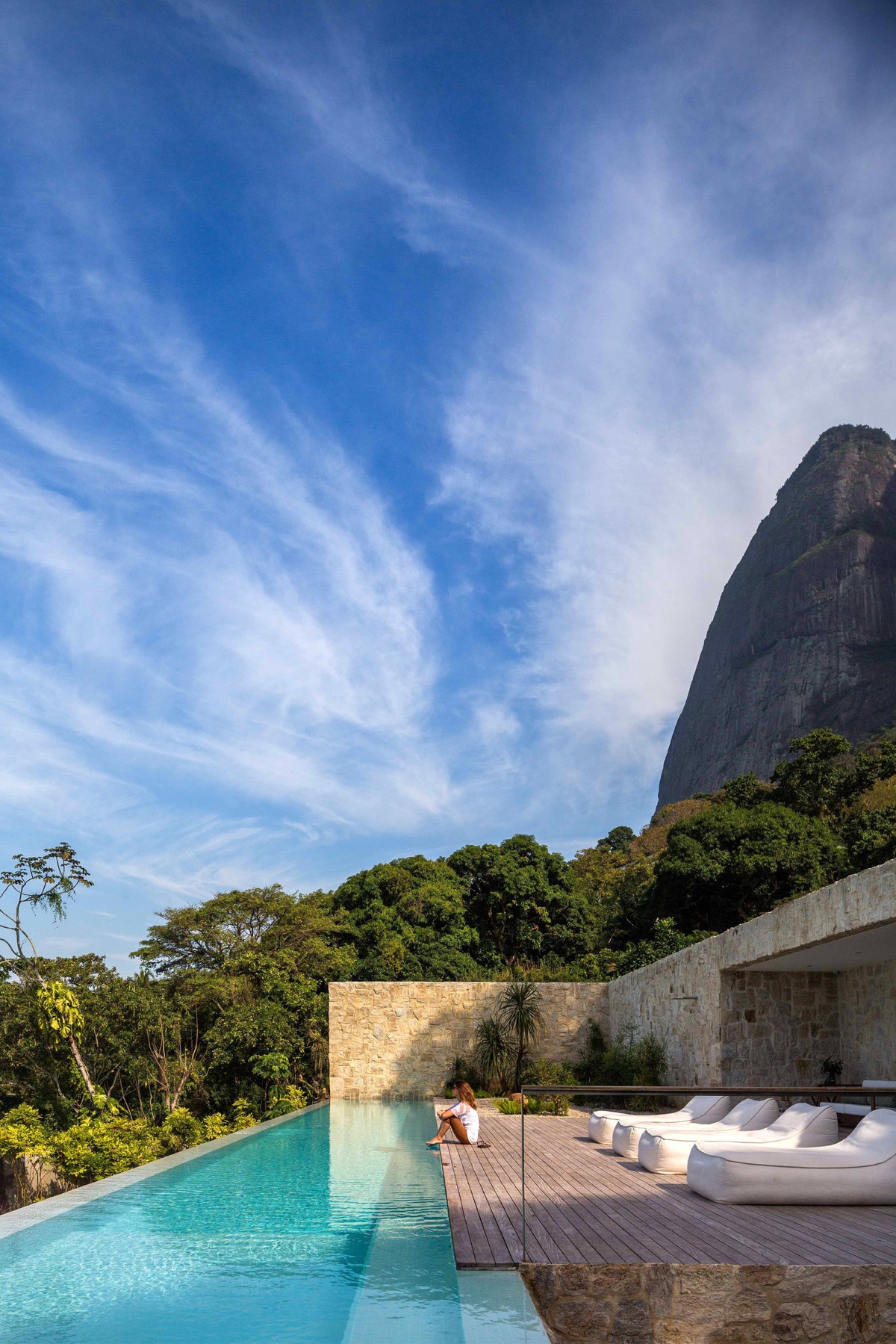 La monolítica montaña Pedra da Gávea sirve de místico telón de fondo para la casa de este presentador de televisión en São Conrado, Río de Janeiro. El Sr. Alex Lerner mandó construir la casa junto al mar para poder revivir la sensación vacacional de la que disfruta cuando pasa sus vacaciones en San Bartolomé.