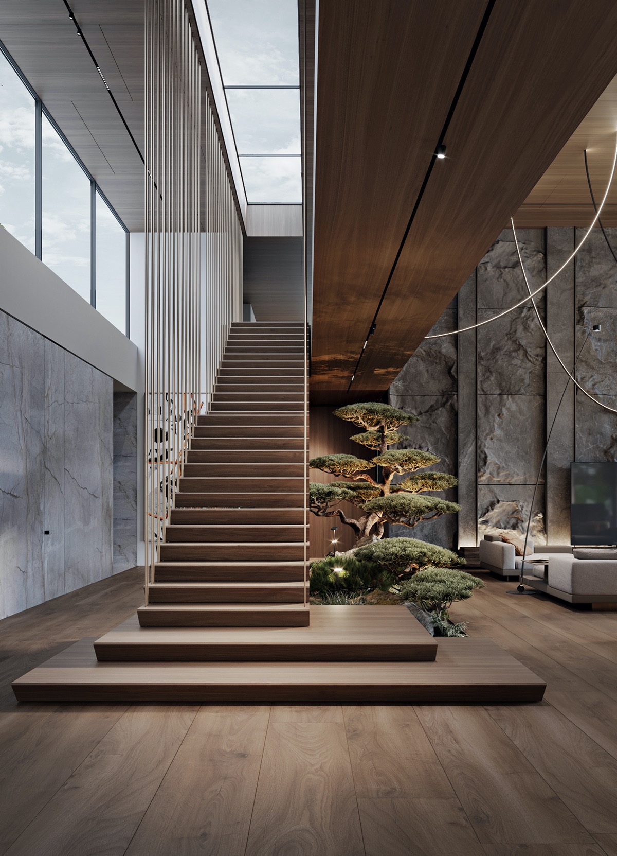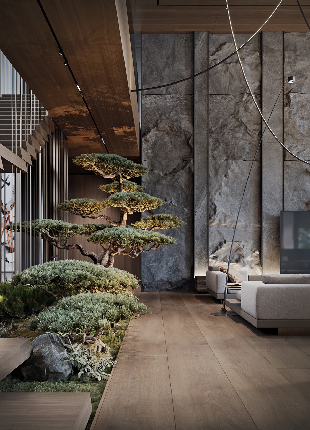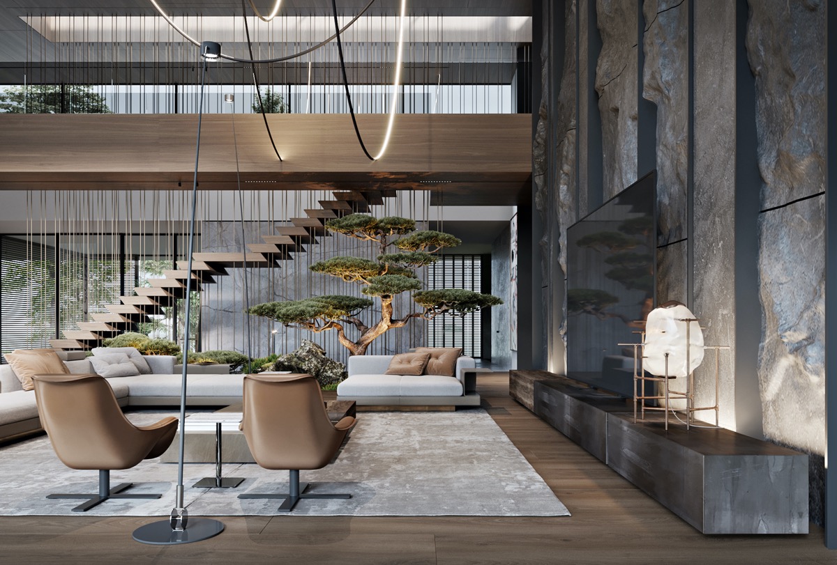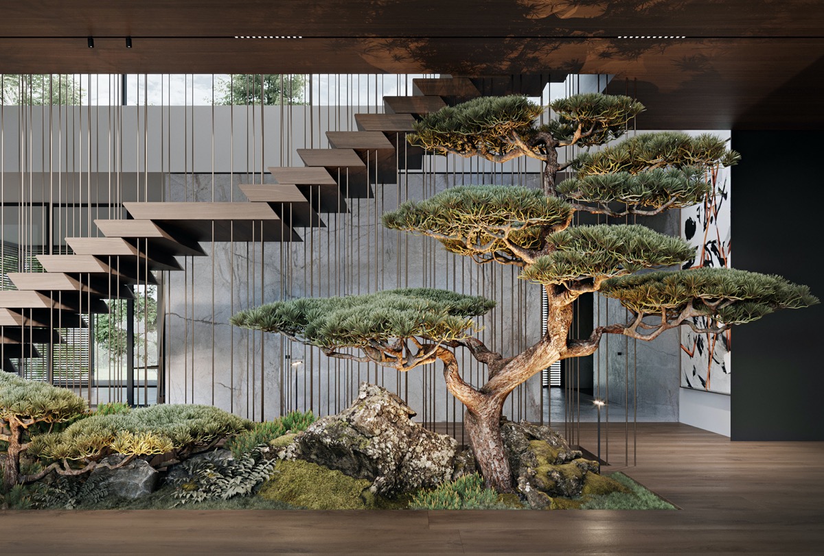 La roca se aplica en baldosas verticales y columnas para infundir el filo de la modernidad. Los majestuosos bonsáis parecen más antiguos de lo que la casa moderna permite, y cultivan una sensación de calma sabia y noble.
