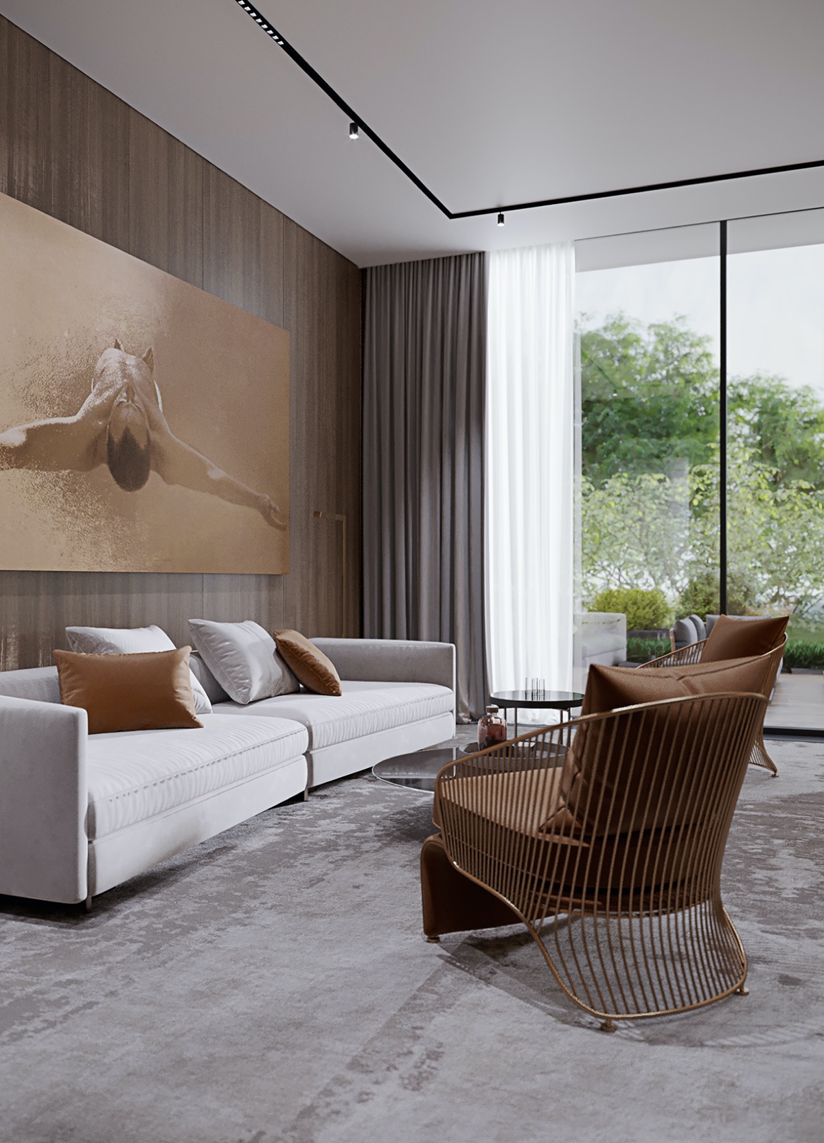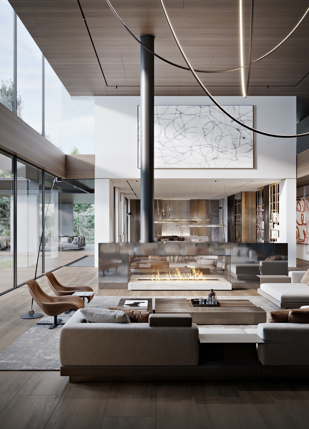 Unas enormes ventanas abren de par en par el lateral del lujoso salón, creando una conexión envolvente con el jardín.
