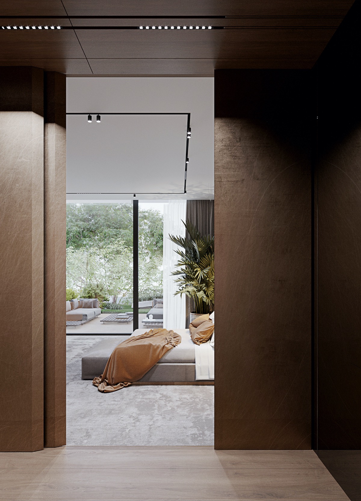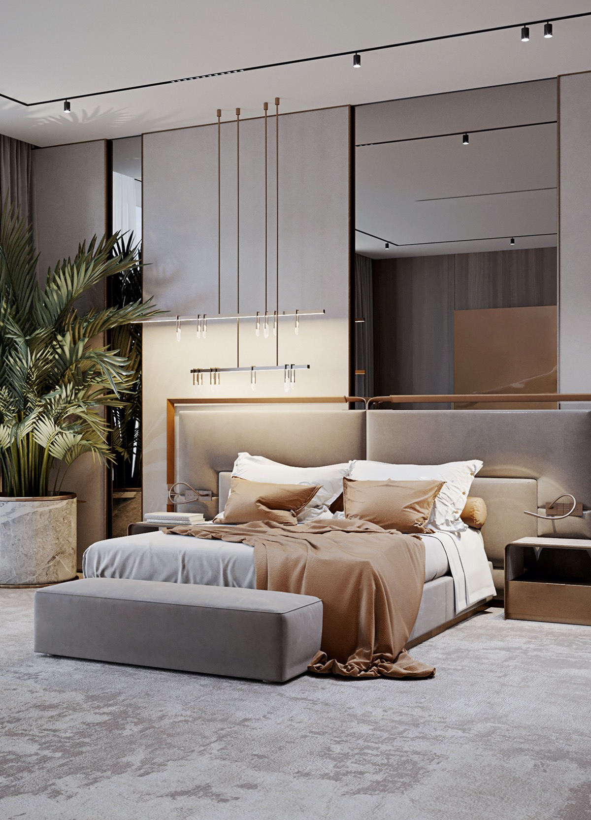 Acogedores cojines marrones y una manta a juego visten una imponente cama de plataforma. El cabecero alargado está equipado con luces de lectura en sus alas, que funcionan en tándem con las preciosas lámparas colgantes del dormitorio. Un banco gris claro al final de la cama combina a la perfección con la tapicería clara de la cama.