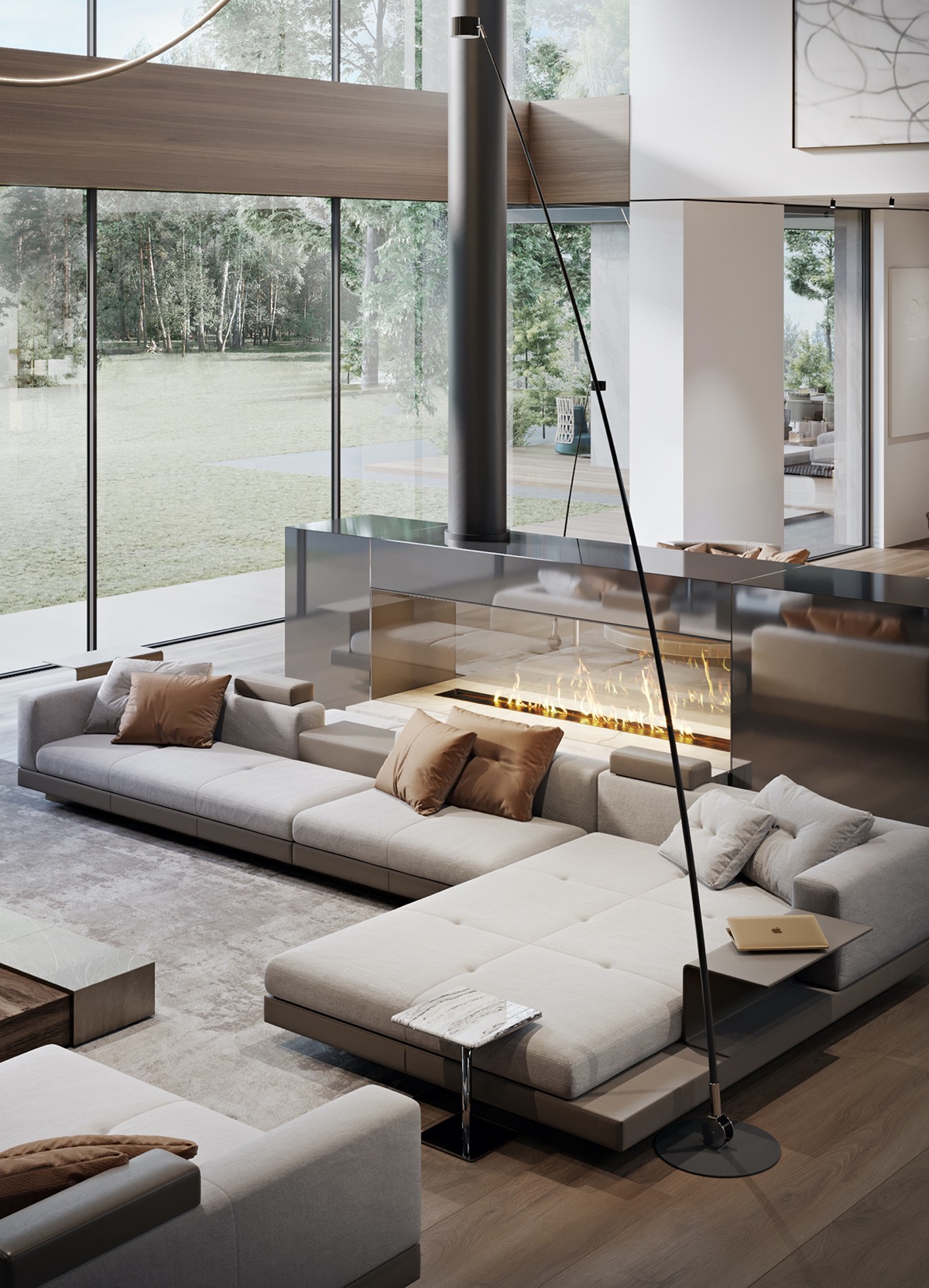 Más lámparas de pie altas bordean el salón al otro lado de la llama abierta.