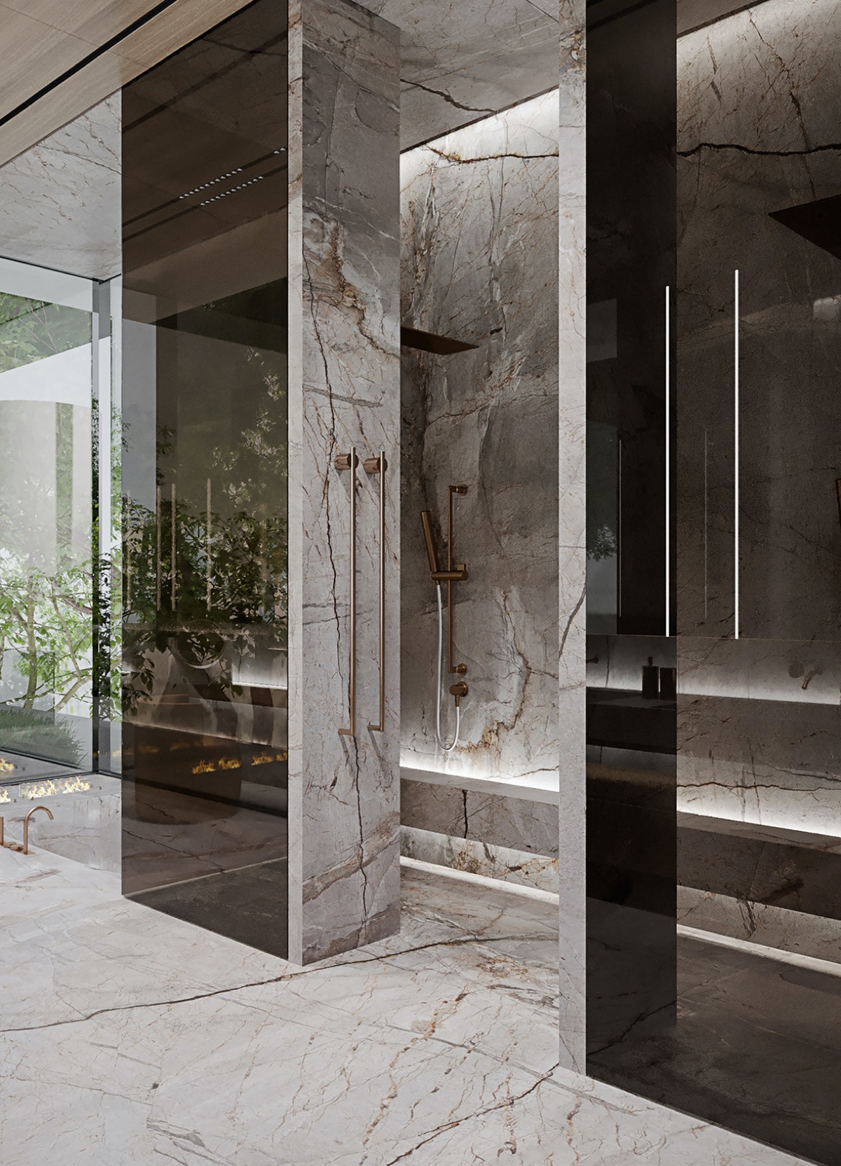 El lujoso cuarto de baño de la suite principal es un pasillo de espejos y cristal, que hace que los árboles del exterior se reflejen en lo más profundo del espacio.