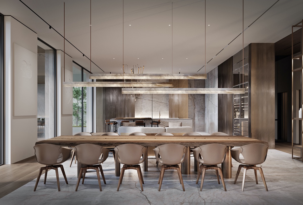 En el lujoso comedor, unas lámparas de araña lineales cuelgan por triplicado sobre un juego de comedor para doce comensales.
