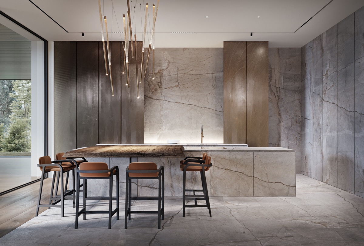 Al fondo de la sala, una lujosa cocina de mármol se prolonga con una isla de comedor de madera natural.