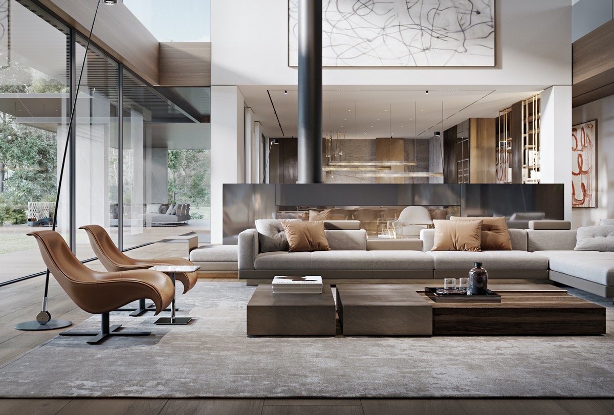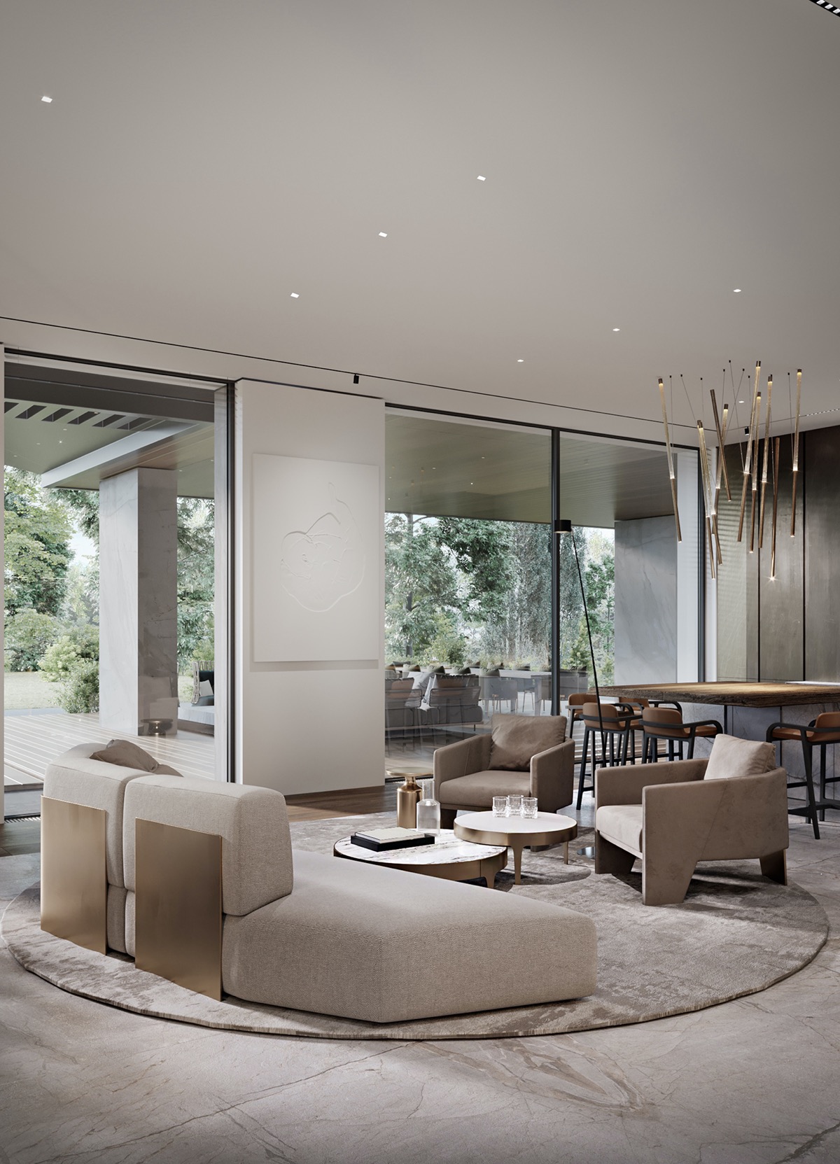 Grosvenor House, en Koncha Zaspa (Ucrania), no es la típica casa de campo. Esta fabulosa casa de 3071,1 metros cuadrados, visualizada por YoDezeen, es líder en estilo. Un amplio salón de doble altura es el escenario de una hipnotizante chimenea de espejos, un gran muro de TV de pared de roca y un lecho de majestuosos bonsáis maduros. Los árboles de interior establecen una apacible conexión con la naturaleza, rodeados por un lecho de rocas musgosas que confieren al paisajismo interior un antiguo sentido de pertenencia.