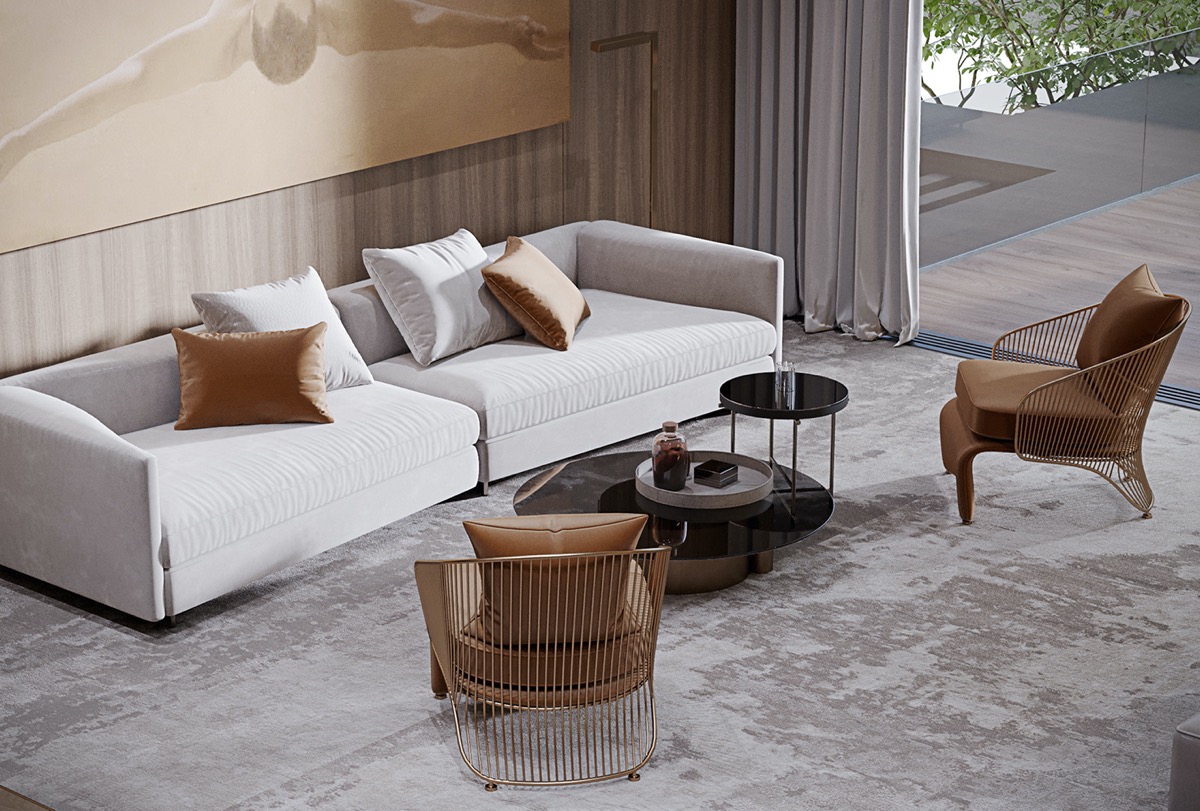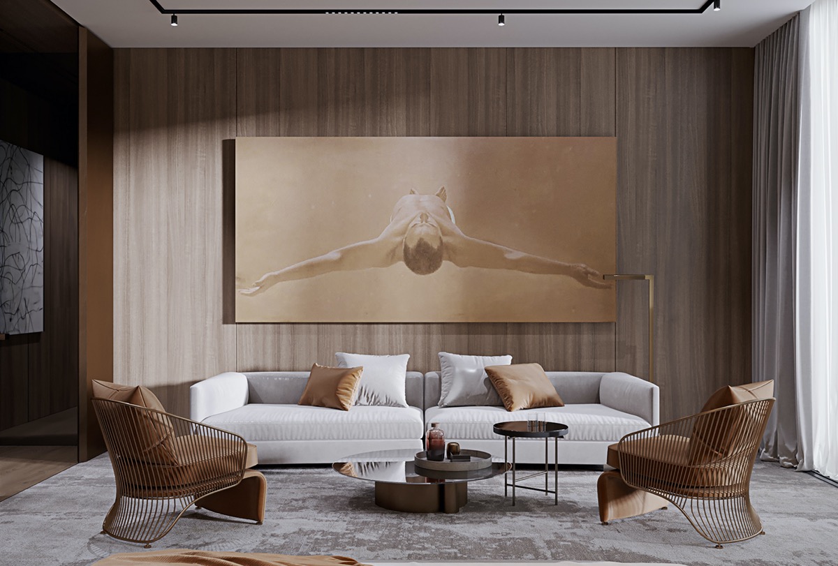 Las llamativas esculturas y el arte mural aportan cultura y fluidez a las formas. La mesa de centro de cristal se mantiene sencilla con recipientes decorativos de cristal.