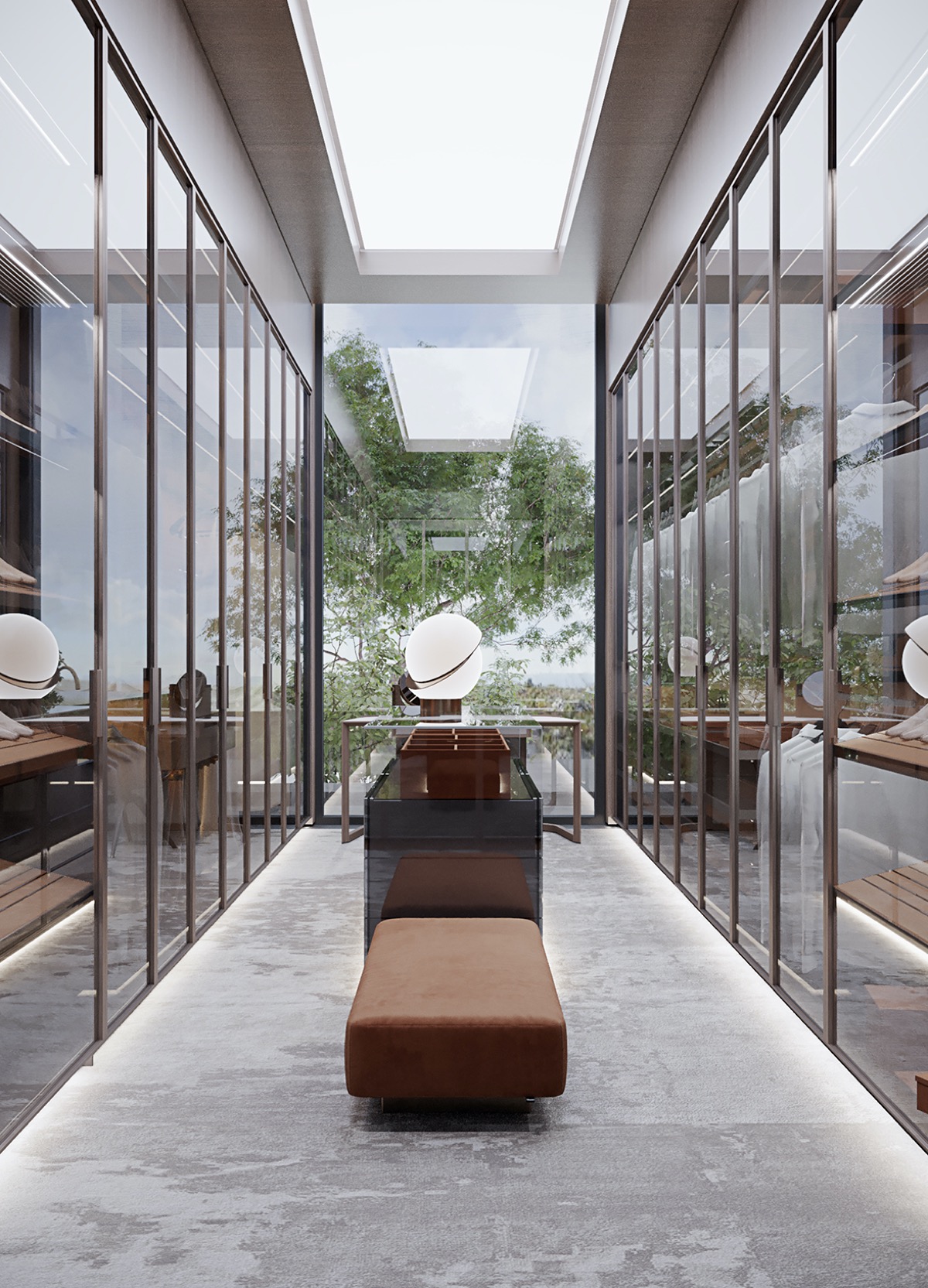 El vestidor es una experiencia impresionante en sí mismo. Un pasillo con claraboya se extiende hacia las copas de los árboles, flanqueado por ligeras vitrinas reflectantes.
