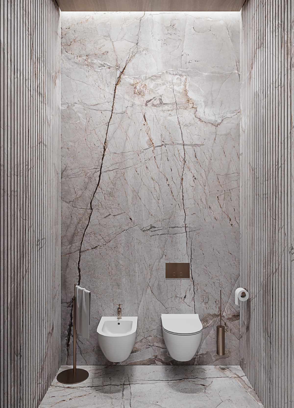 Una de las paredes de mármol esconde un secreto. Los paneles blancos elegantemente veteados se deslizan hacia atrás para revelar un rincón de electrodomésticos de cocina de última generación.