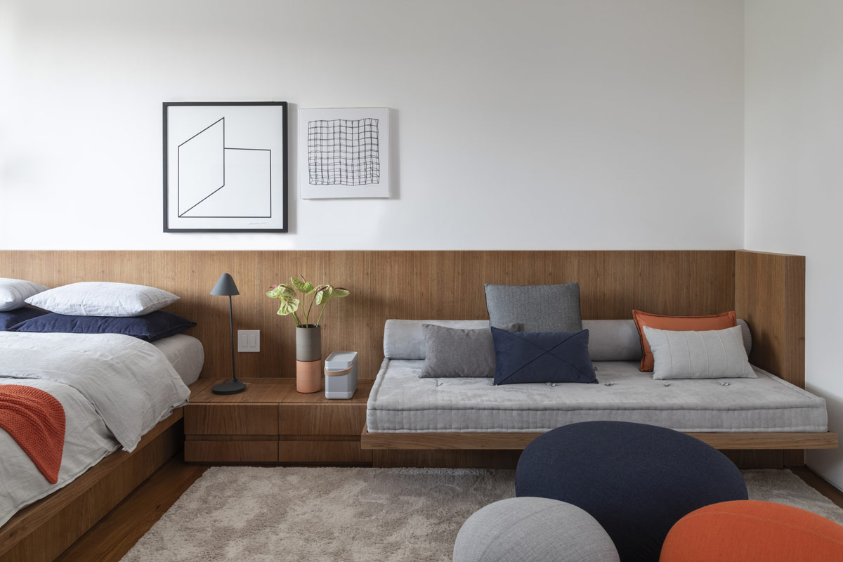 La combinación de colores es ciertamente enérgica, con acentos como almohadas y pufs en azul oscuro y naranja vibrante.