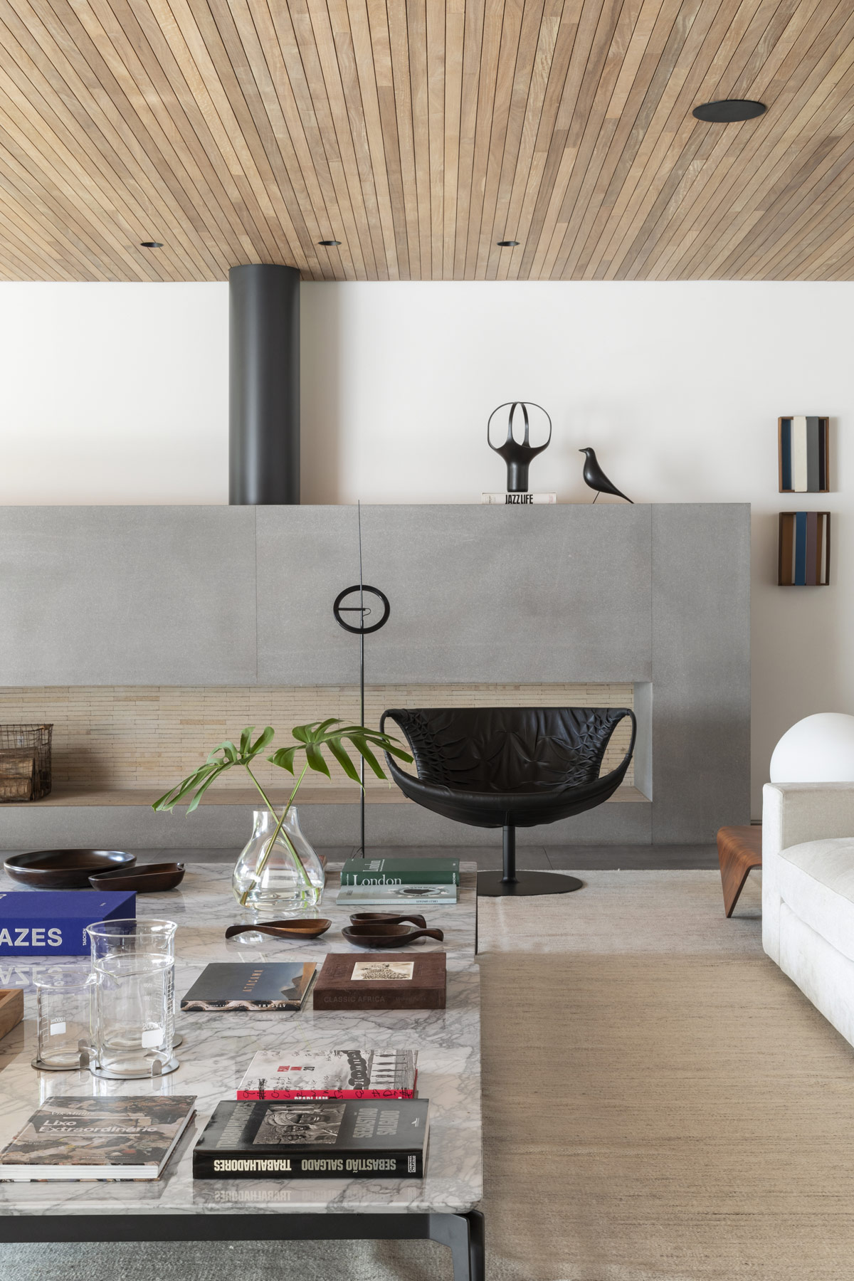 Cerca del ancho hogar de la chimenea hay una bonita silla. Pequeños adornos salpican la repisa, incluido el icónico pájaro Eames en negro a juego.