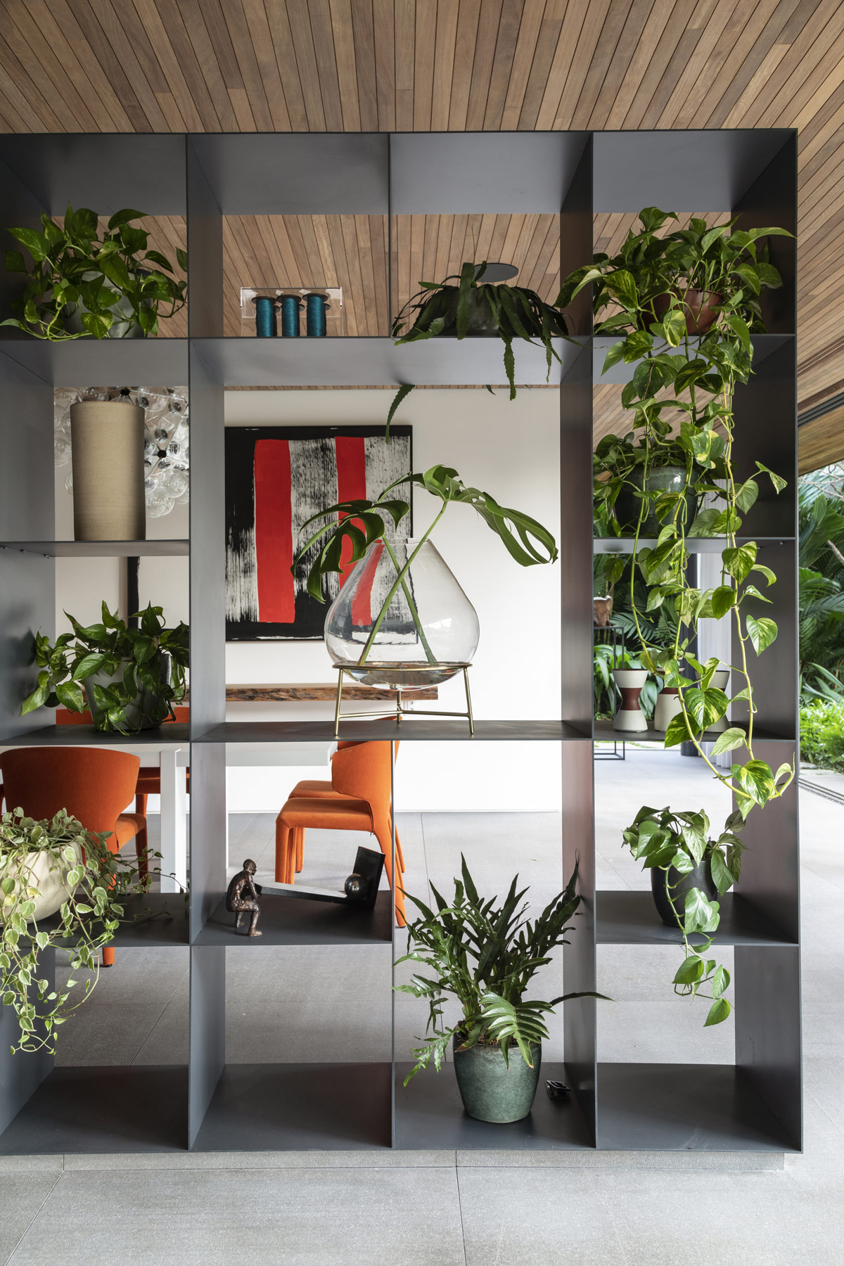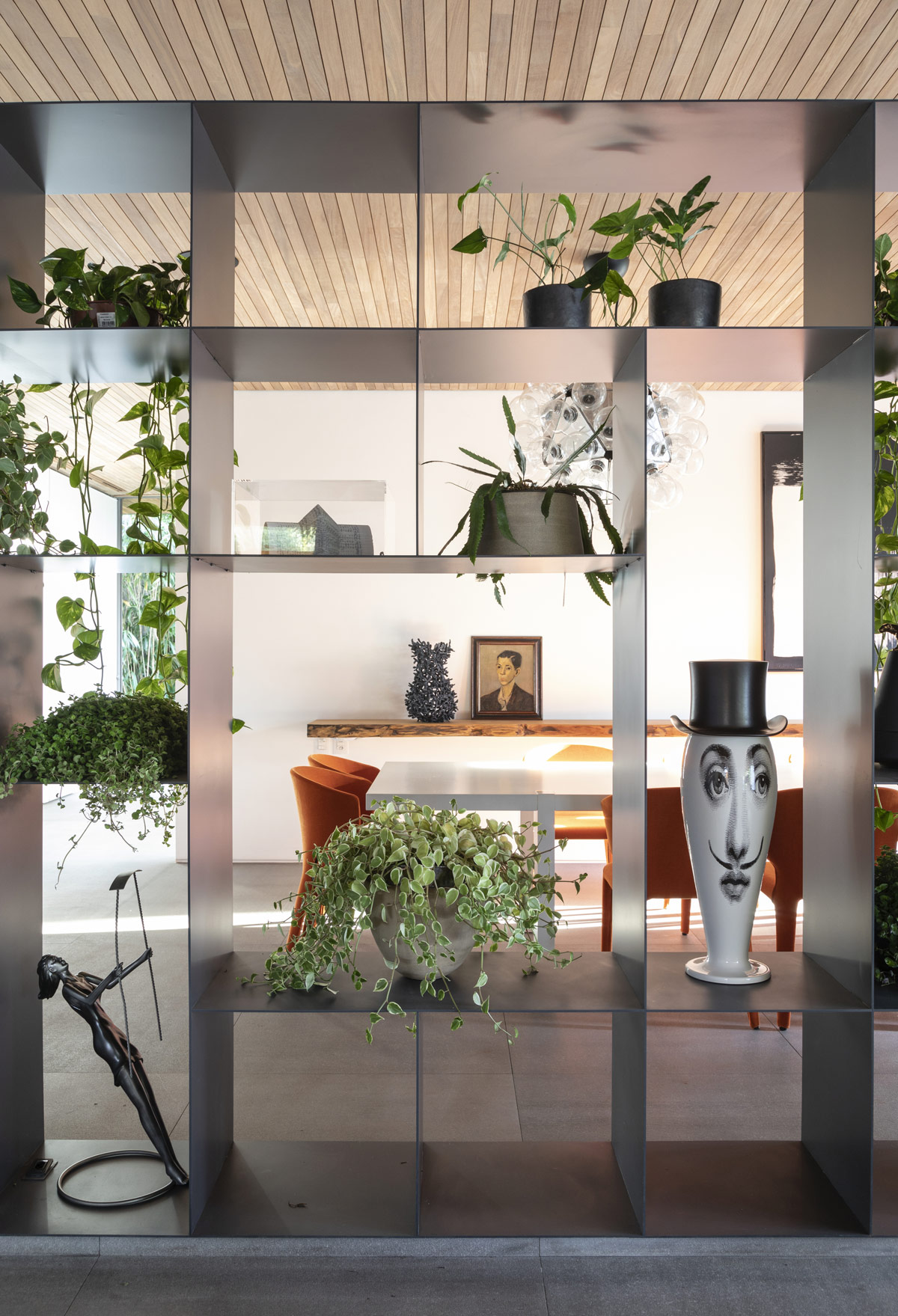Unas elegantes estanterías sirven de separador entre la sala de estar y el comedor formal. Una serie de esculturas y plantas de interior protegen parcialmente la mesa para dar un toque de intimidad.